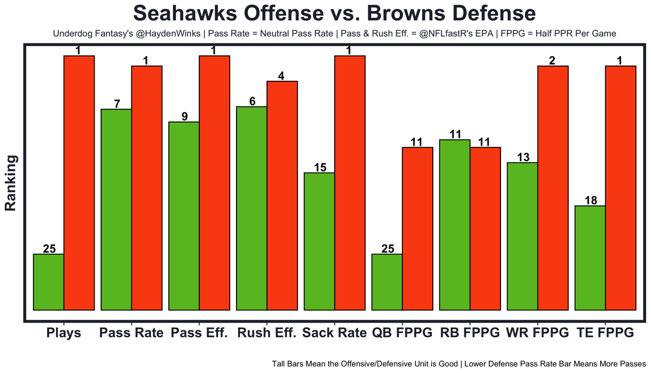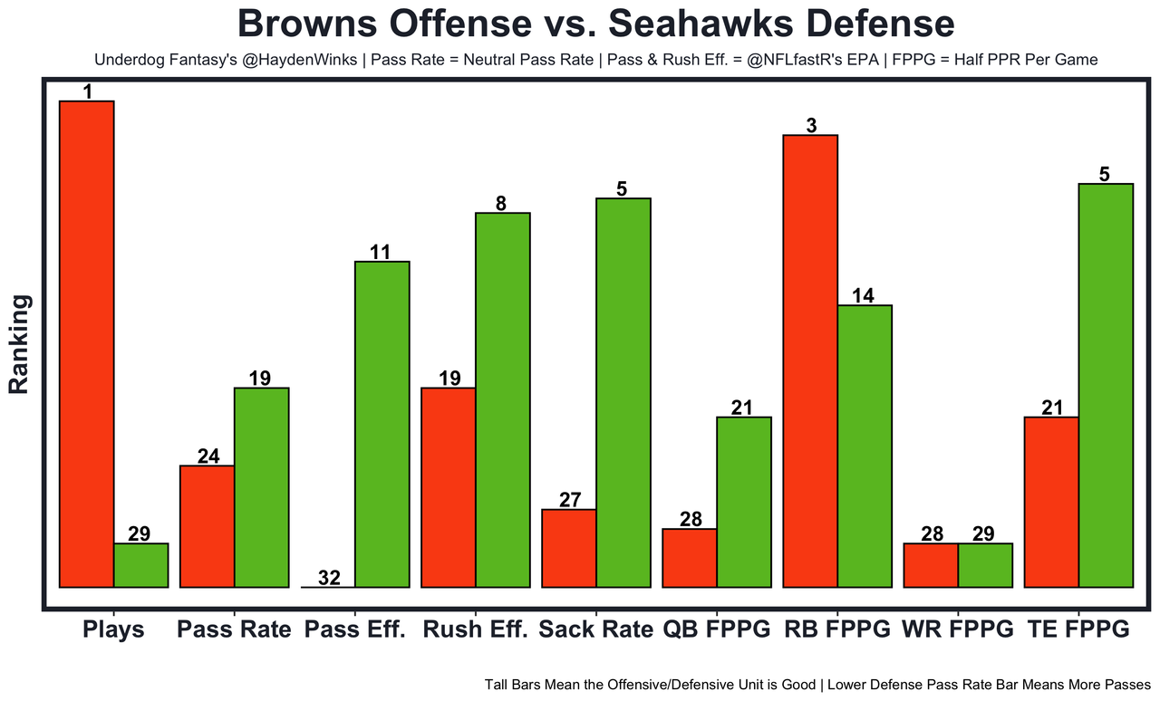 Seattle is expected to get DK Metcalf (hip) back this week after a full practice on Wednesday, and they'll need him against a studly Browns defense. They're No. 1 in sack rate, passing EPA allowed, and neutral pass rate allowed thanks to super start genetic wonder Myles Garrett. On top of that, Cleveland also forces "Prayer Targets" at the highest rate in the NFL. Smith will need to be a baller to be a fringe QB1. The Seahawks have an average 20.75-point team total.