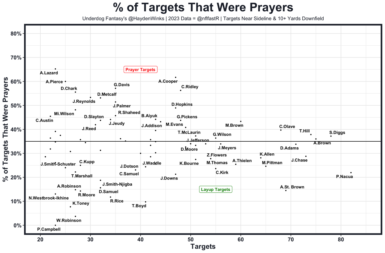 Marquise Brown - He's the WR34 on WR10 usage over this month after running bad on downfield targets recently after being fine on them early this year. We're nearing a Kyler Murray return, too. 50.5 receiving yards in Pick'em.