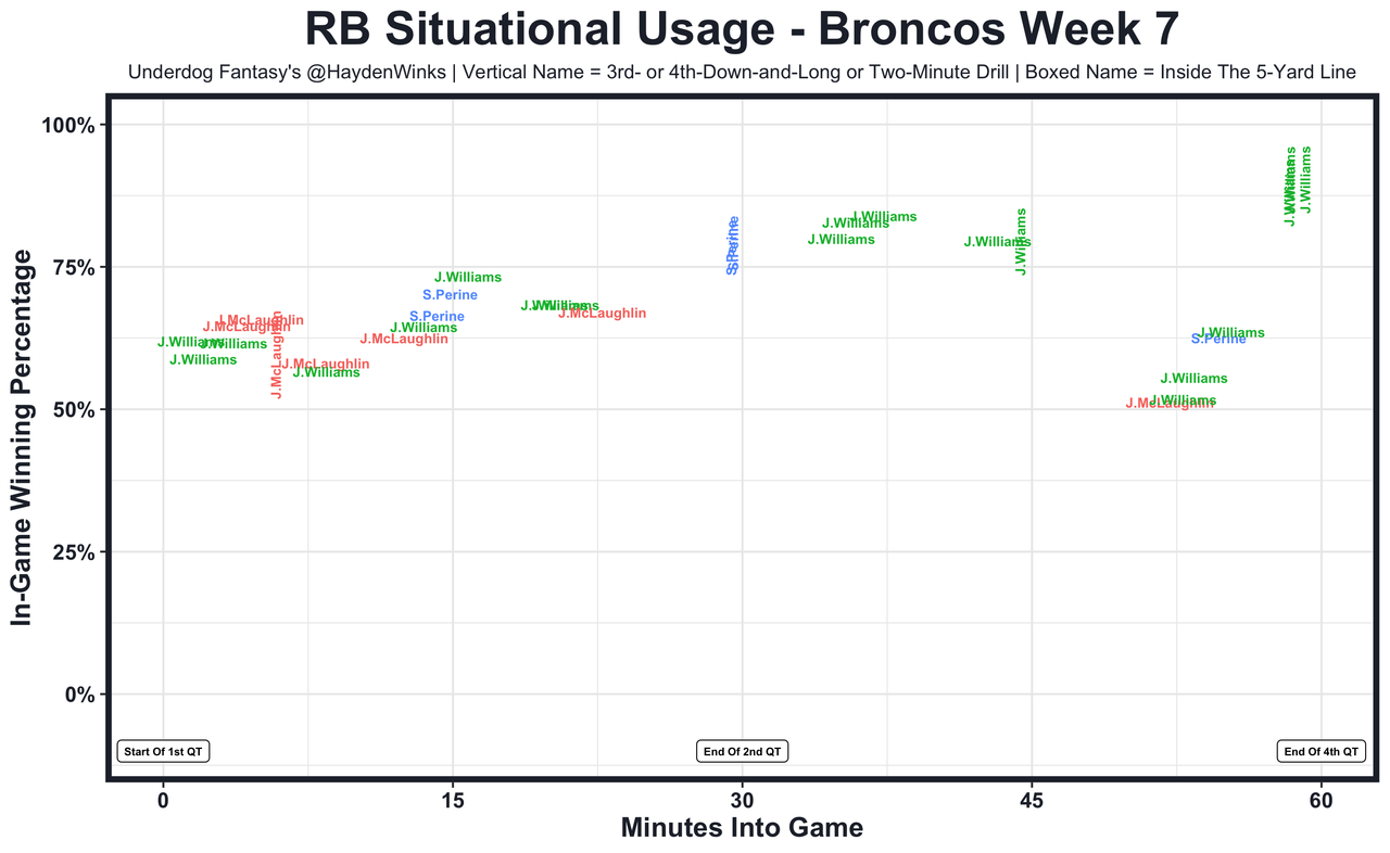 Javonte Williams - He'll need positive game scripts to pay off, as he had 4.3 expected half PPR points in Week 6's loss and 11.5 expected half PPR points in Week 7's win, with change-of-pace speedster Jaleel McLaughin and reliable pass-catcher Samaje Perine both mixing in. It's a bad set up on paper for Javonte against the Chiefs as 8.0-point dogs. Kansas City is 5th-best against fantasy RBs. 67.5 total yards in Pick'em.