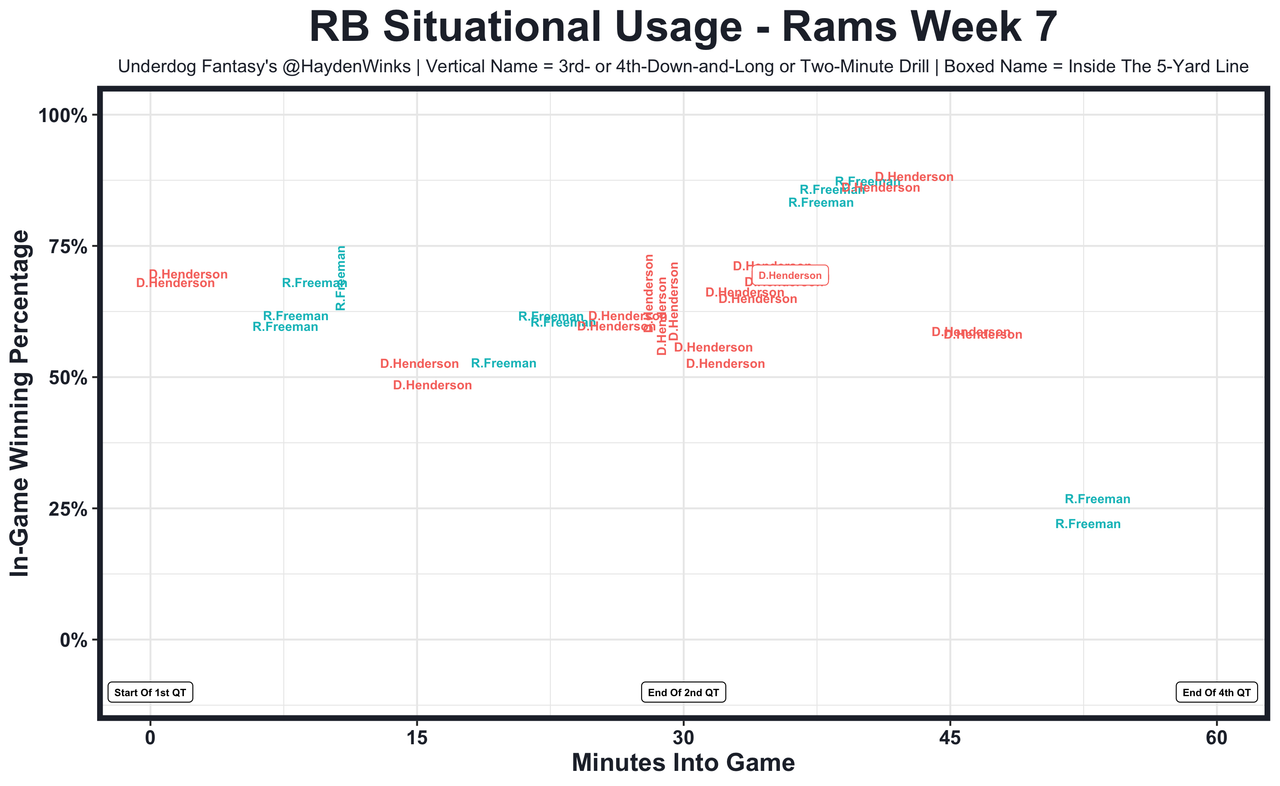 Darrell Henderson - He started, played 57% snaps, handled the lone goal line attempt, and finished with 14.9 expected half PPR points in his Rams debut. Royce Freeman was the clear No. 2, as he handled full drives himself. It's possible Myles Gaskin is active over Zach Evans this week, but it'd be a surprise if it wasn't Henderson and Freeman as the top dogs this week. Hendo will get a head start in a race to establish a "hot" "hand".