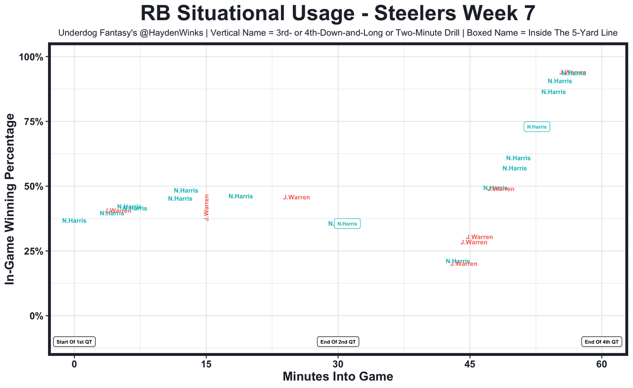 Jaylen Warren - He has between 6.0 and 10.1 expected half PPR points in every game as a clear No. 2 to Najee. 49.5 total yards in Pick'em.