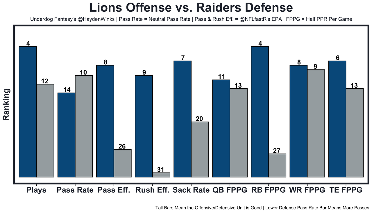 Josh Reynolds - Goff is the QB1 when kept clean, and the Raiders can't rush the passer even with Maxx Crosby being a total dog. Reynolds can work downfield, while still running more routes (45-of-61) than Jameson Williams (26). 35.5 receiving yards in Pick'em.