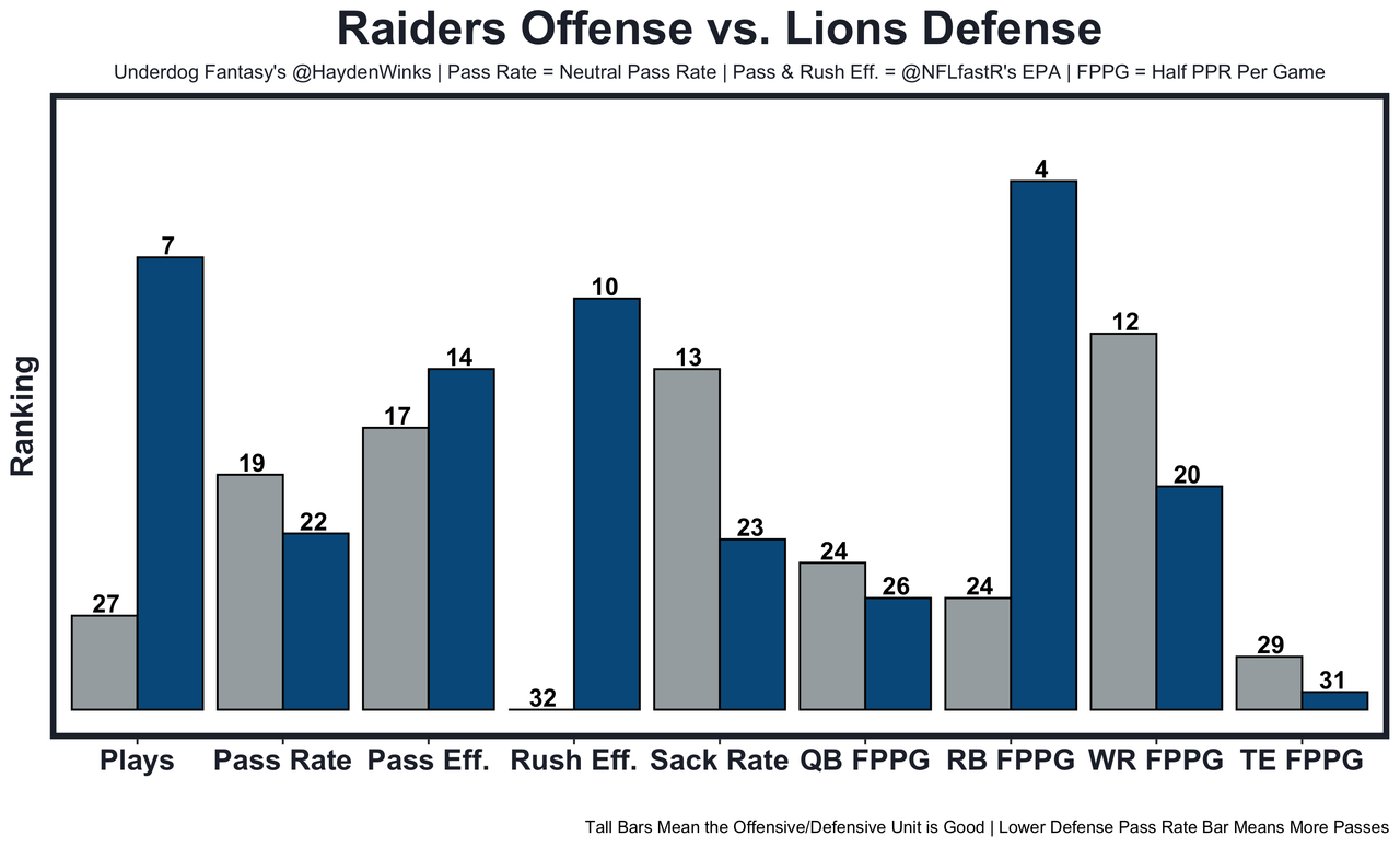 Jahmyr Gibbs - He's had 15.3 and 18.0 expected half PPR points in two starts without David Montgomery. Last week was ideal game script for him in complete garbage time, but he did play most snaps and was used in advantageous ways. OC Ben Johnson primarily ran him on the perimeter and with misdirection to hide his limitations, and the Raiders DL (aside from alpha EDGE Maxx Crosby) is very beatable this week. Lesser RBs like D'Onta Foreman (31.5 half PPR), Rhamondre Stevenson (15.5), Ezekiel Elliott (11.4), AJ Dillon (13.6), James Cook (17.9), and Latavius Murray (10.1) have gotten home against Las Vegas. 96.5 total yards in Pick'em.