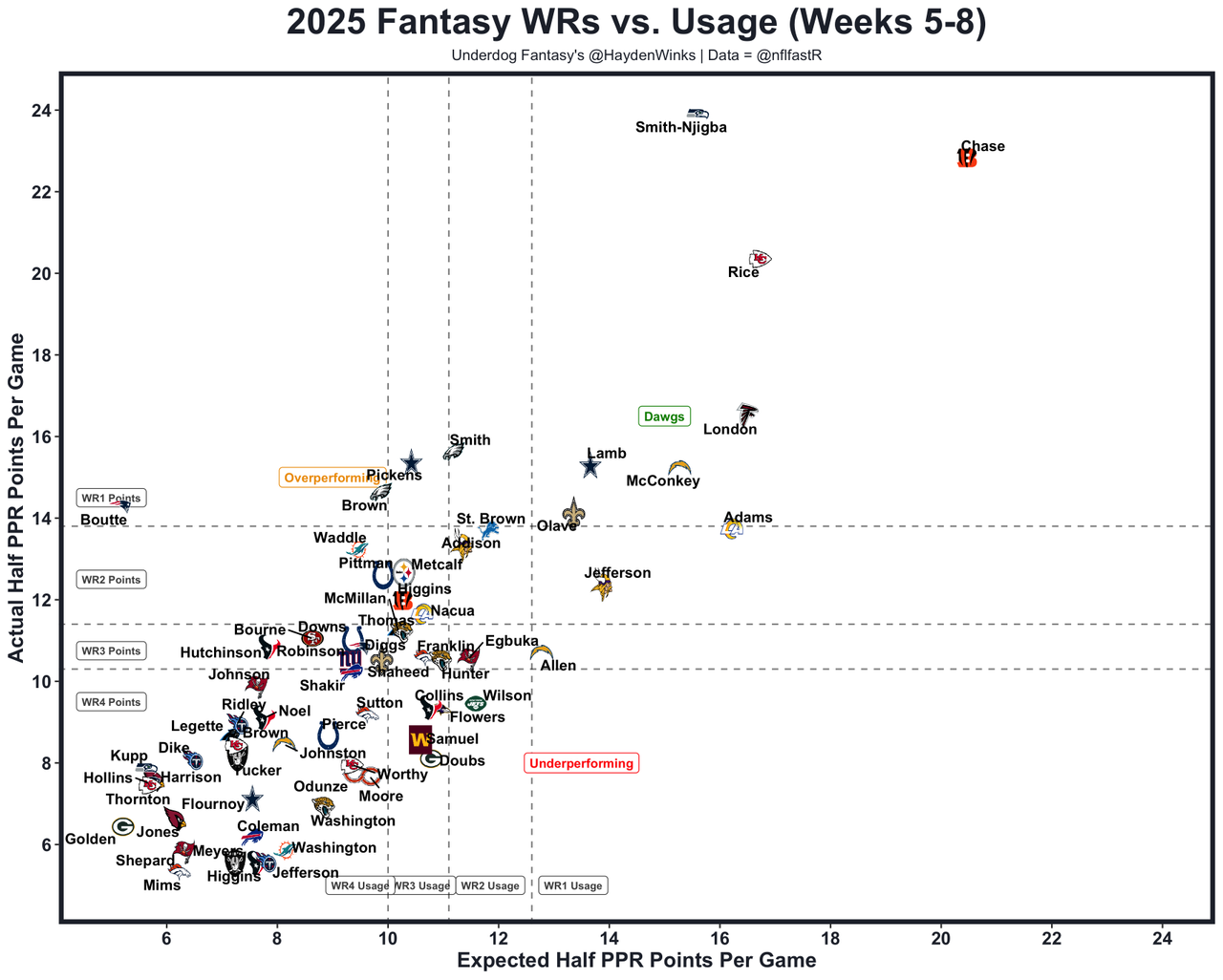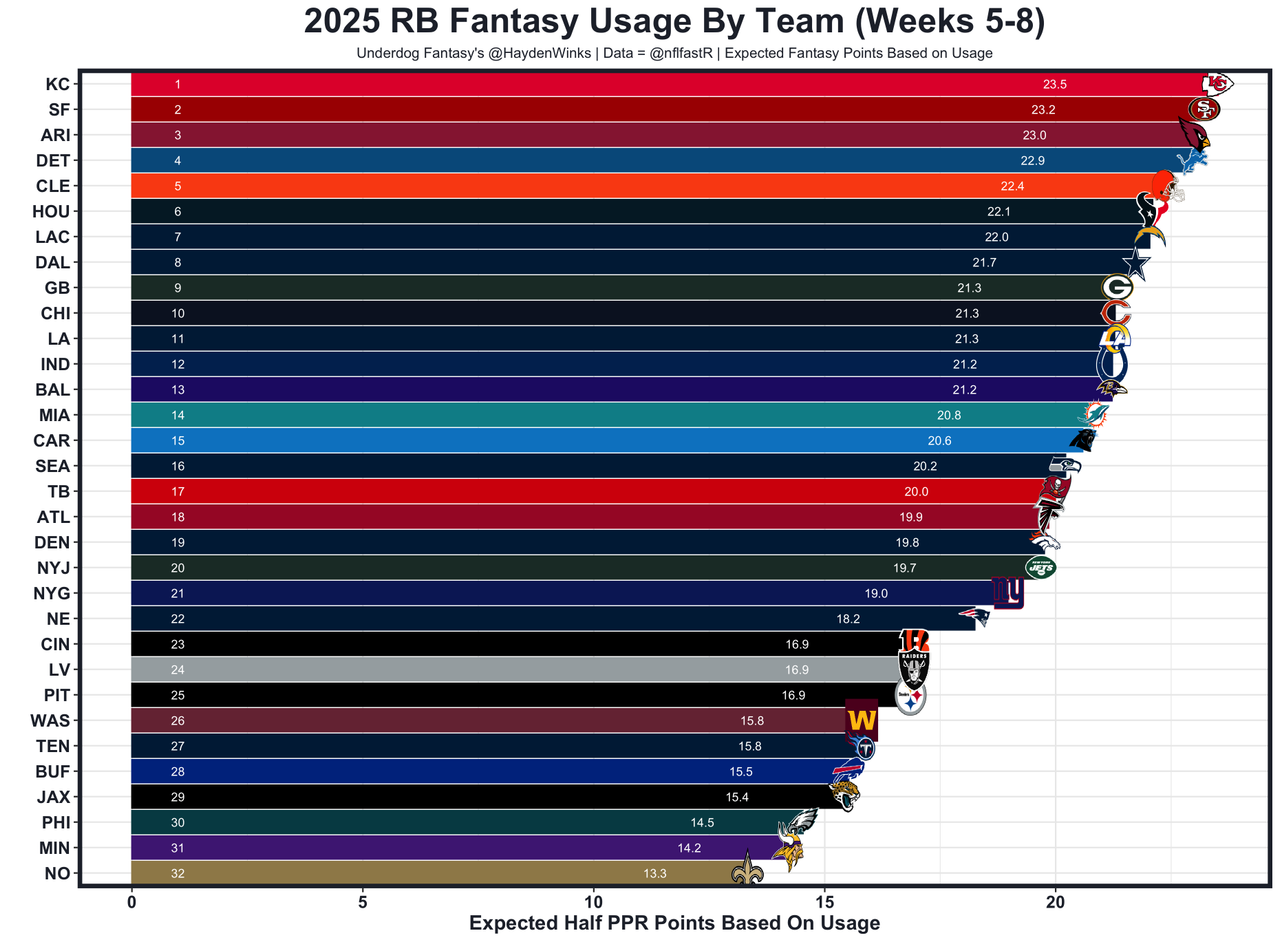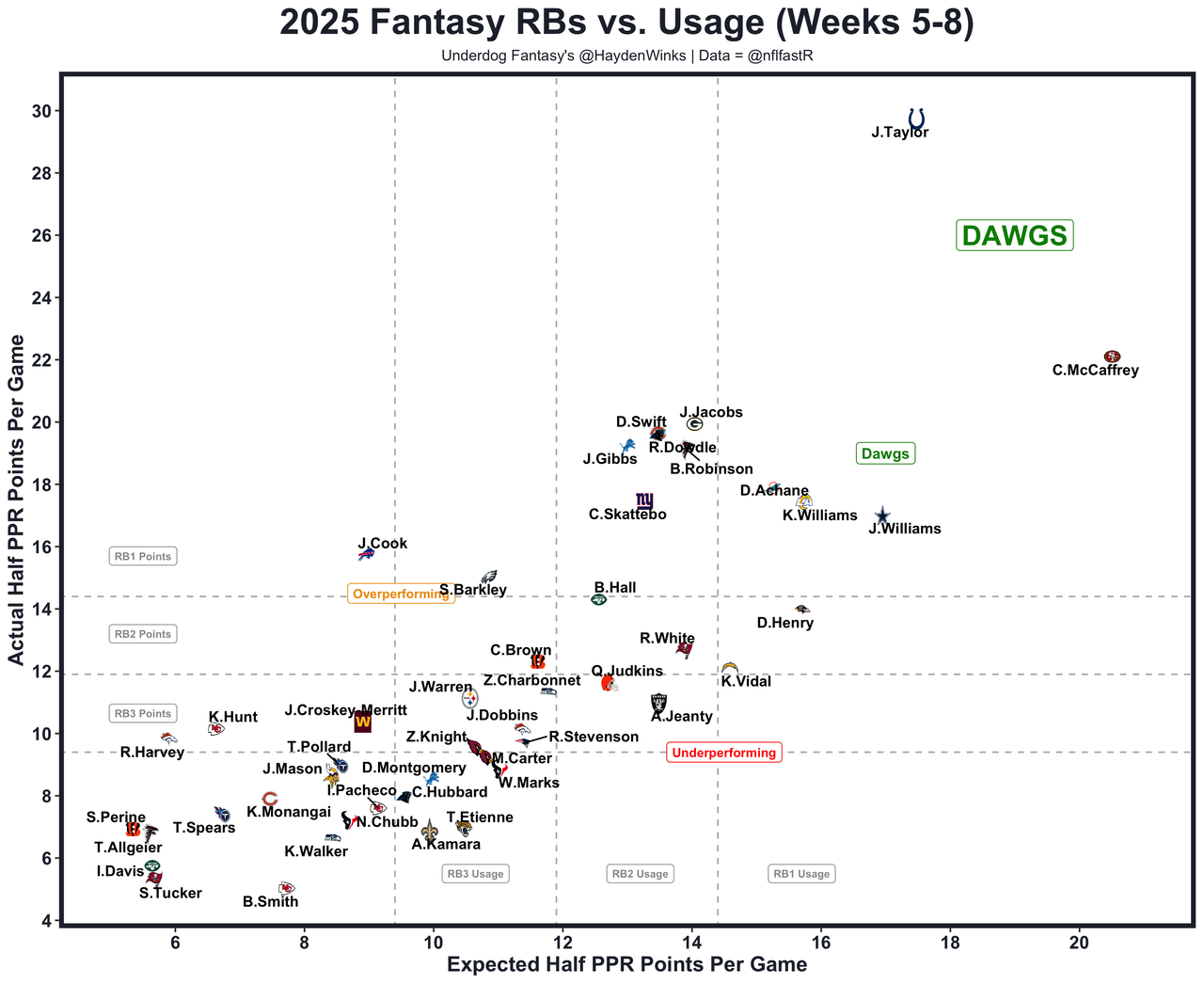 Posted every Tuesday, The Fantasy Usage Model combines my expected fantasy points model with his film notes to recap the previous week's game. An explanation of this is here, but it basically turns targets, carries, air yards, goal line touches, and other variables into expected fantasy points. We have the sickest fantasy show ever on Tuesday nights going over this column. If you have time for 1 hour of fantasy content, make it this one.
