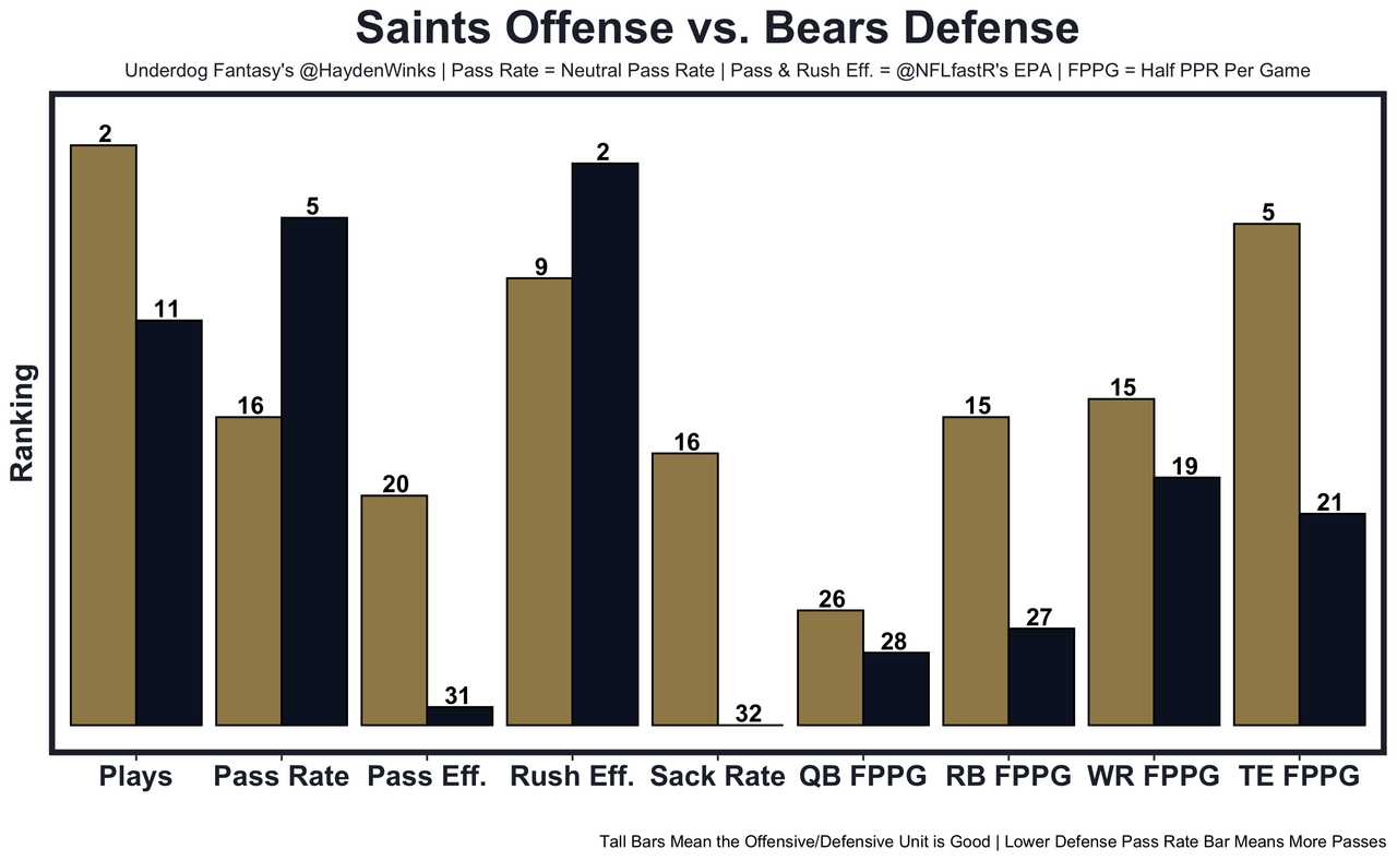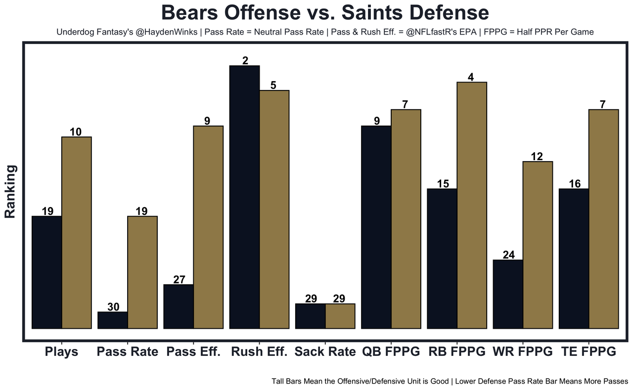 Cole Kmet - Expected half PPR points: With Justin Fields (8.6), without (5.8). Only the Browns have allowed fewer receptions per game to TEs than the Saints have. 30.5 receiving yards in Pick'em.