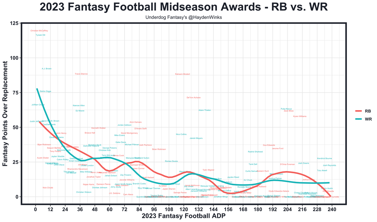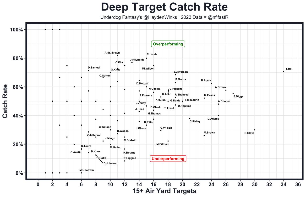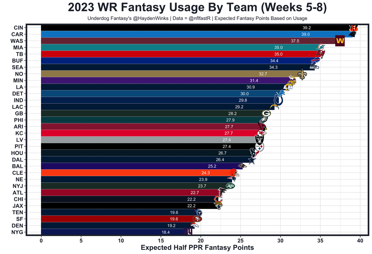 Every site has a fantasy football rankings column. None of them will be as charted up on a Thursday afternoon as this one. I'll go position-by-position with the charts, matchup notes, film, and injury nuggets that I view as worth your time. I also have my recap column where I have quick notes on the top 200 players' usage and film, in addition to their expected half PPR points based on their usage. Here is the data: