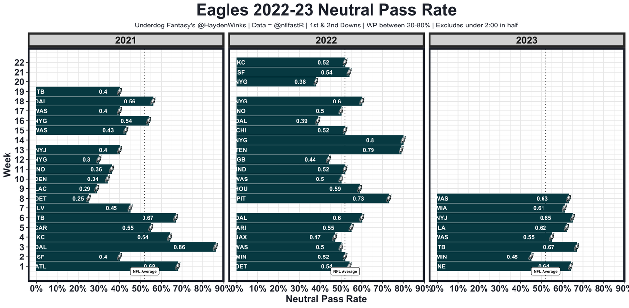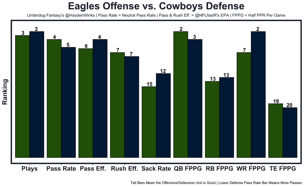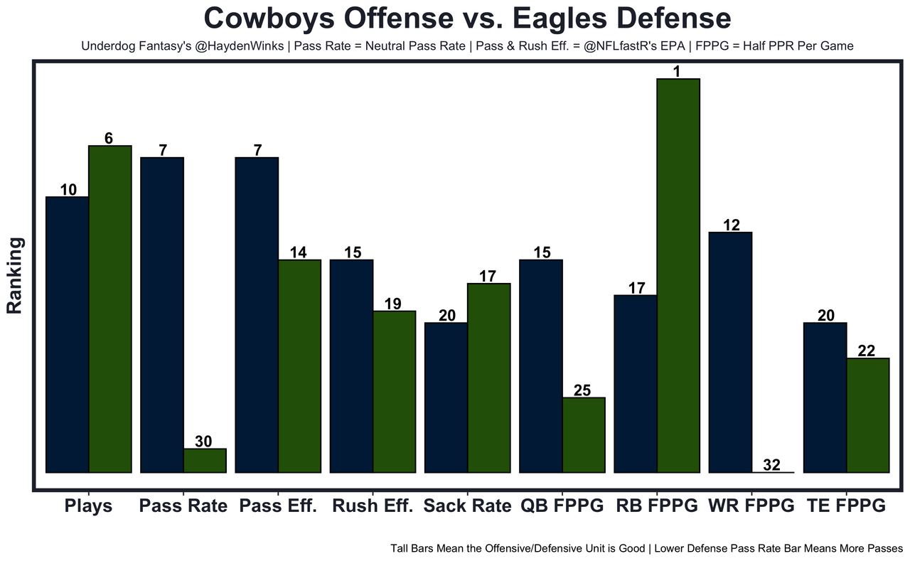 Jake Ferguson - He's averaging 8.1 expected half PPR points this season and finally scored on a beautiful seam ball from Dak last week. Ferg Daddy is a capable check down option if the Eagles' run defense proves too strong to keep a balanced approach. Logan Thomas (13.4 half PPR), T.J. Hockenson (22.1), and Hunter Henry (14.1) have popped up against Philly this season. 33.5 receiving yards in Pick'em.