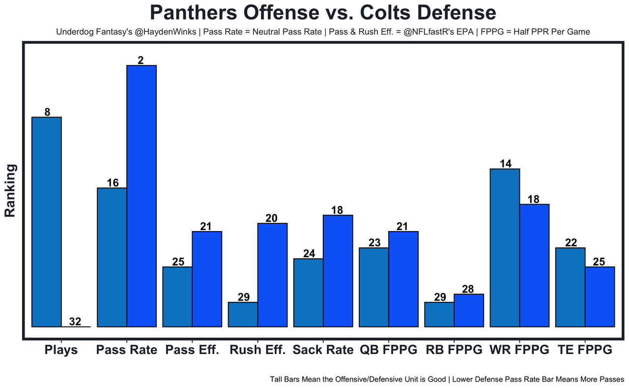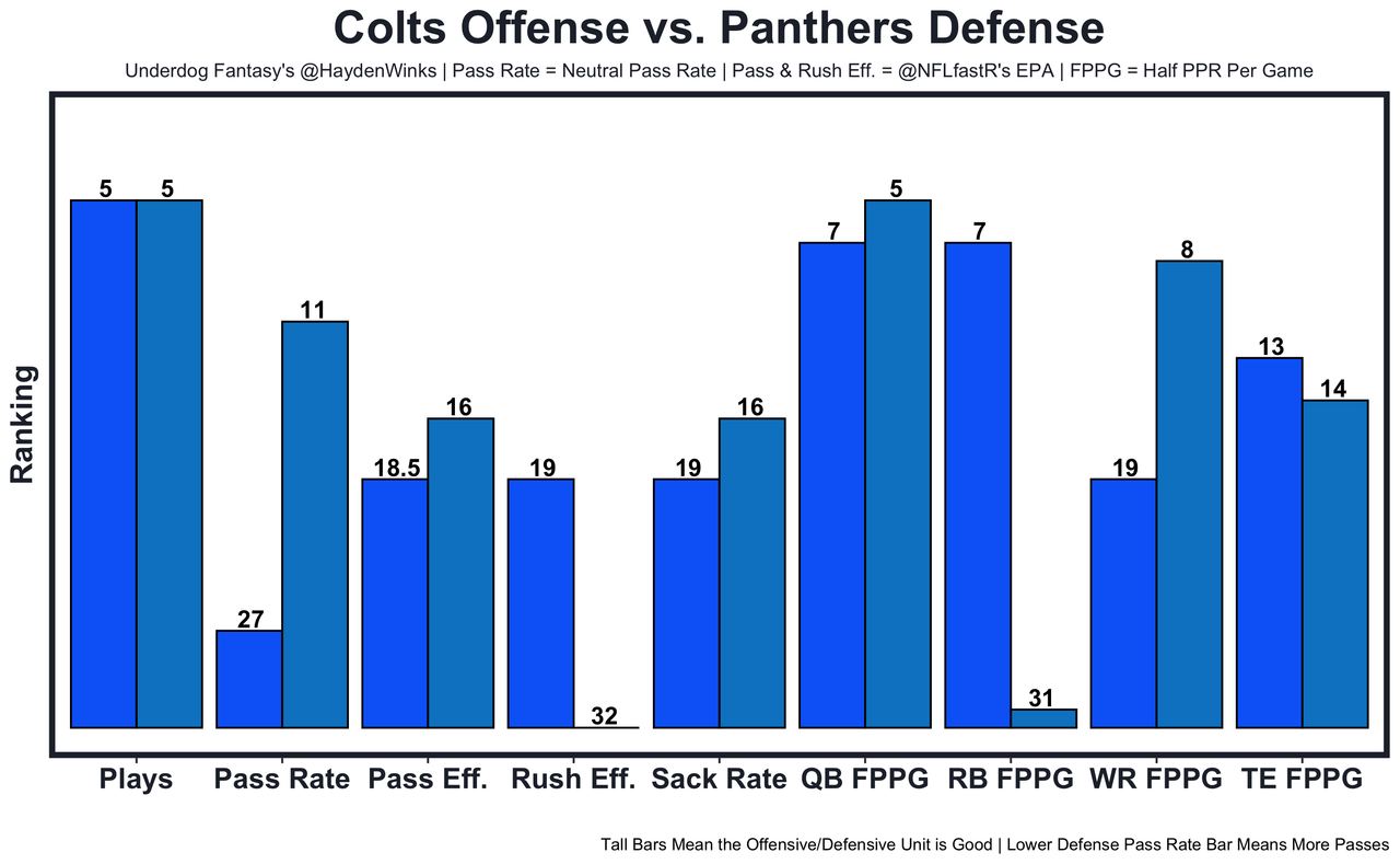 This Colts defense is allowing a league-high 69 plays per game, leading to a No. 21 ranking against fantasy QBs, and they could be without 2nd-round rookie CB JuJu Brents (quad) this week. Young made some great throws last week with new play caller OC Thomas Brown mixing some things up, including a higher-than-normal pass rate. That said, the Panthers did score 15 points at home against the Texans and still couldn't run the ball effectively. 15.55 fantasy points in Pick'em.