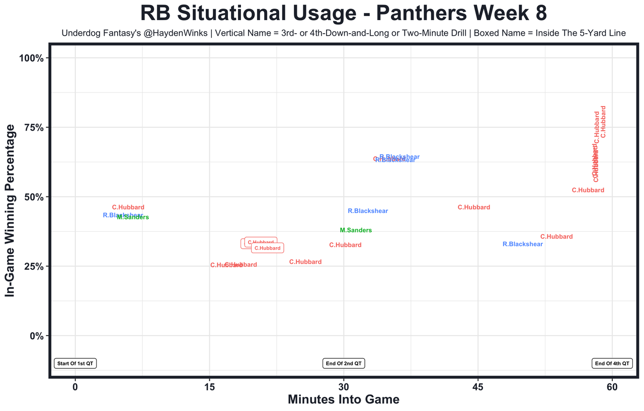 Chuba Hubbard - Did it work? No. But Hubbard came out of the bye as the starter, goal line back, and game finisher, while Miles Sanders counted dollar bills on the sideline. The Panthers have a broken OL and this is a fickle, floor-less situation. Still, Hubbard's season-high 15.4 expected half PPR points aren't to be ignored during bye week hell, especially against a defense allowing a very nice 69 plays per game (most in the NFL). Carolina's 21.0-point team total is no longer embarrassing. 8.65 fantasy points in Pick'em.