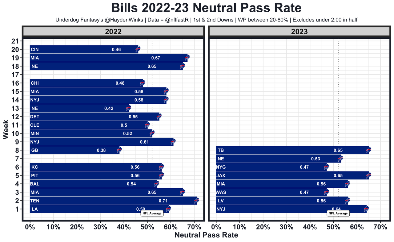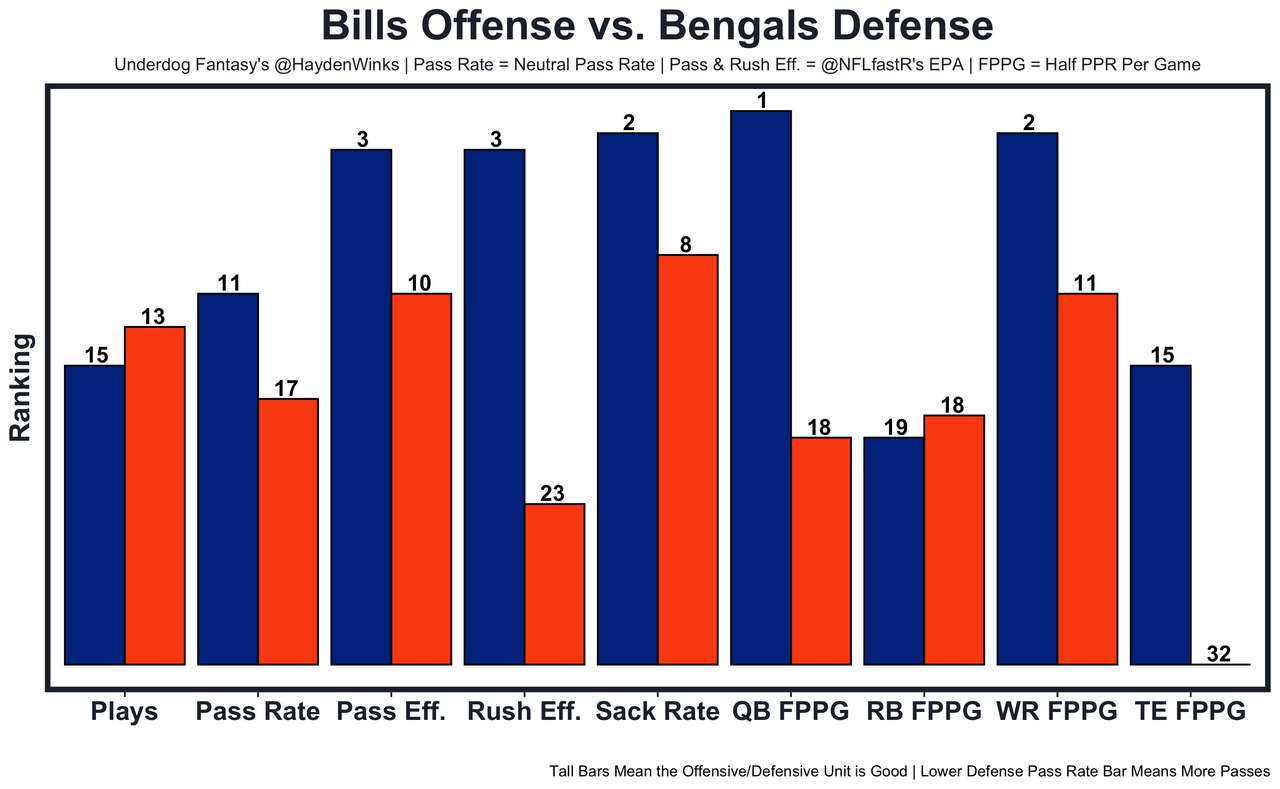 Allen's shoulder injury is limiting him in practice, but the AC joint is something that can be played through (sometimes with pain injection). What's more interesting is the Bills history with the Bengals. Stud DC Lou Anarumo forced Buffalo into an outlier 46% neutral pass rate in the Bills' home playoff loss, and Allen said it was simulated pressures and funky zone defense that limited him to 264-0-1 on 25-of-42 (59%) passing. That type of defense would be less effective if the Bills continue on with last week's empty spread, RPO heavy offense. Last week was one of the highest neutral pass rates in the Allen era, and it looked really clean. 21.85 fantasy points in Pick'em.
