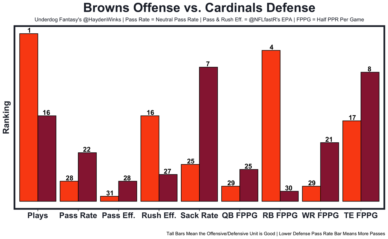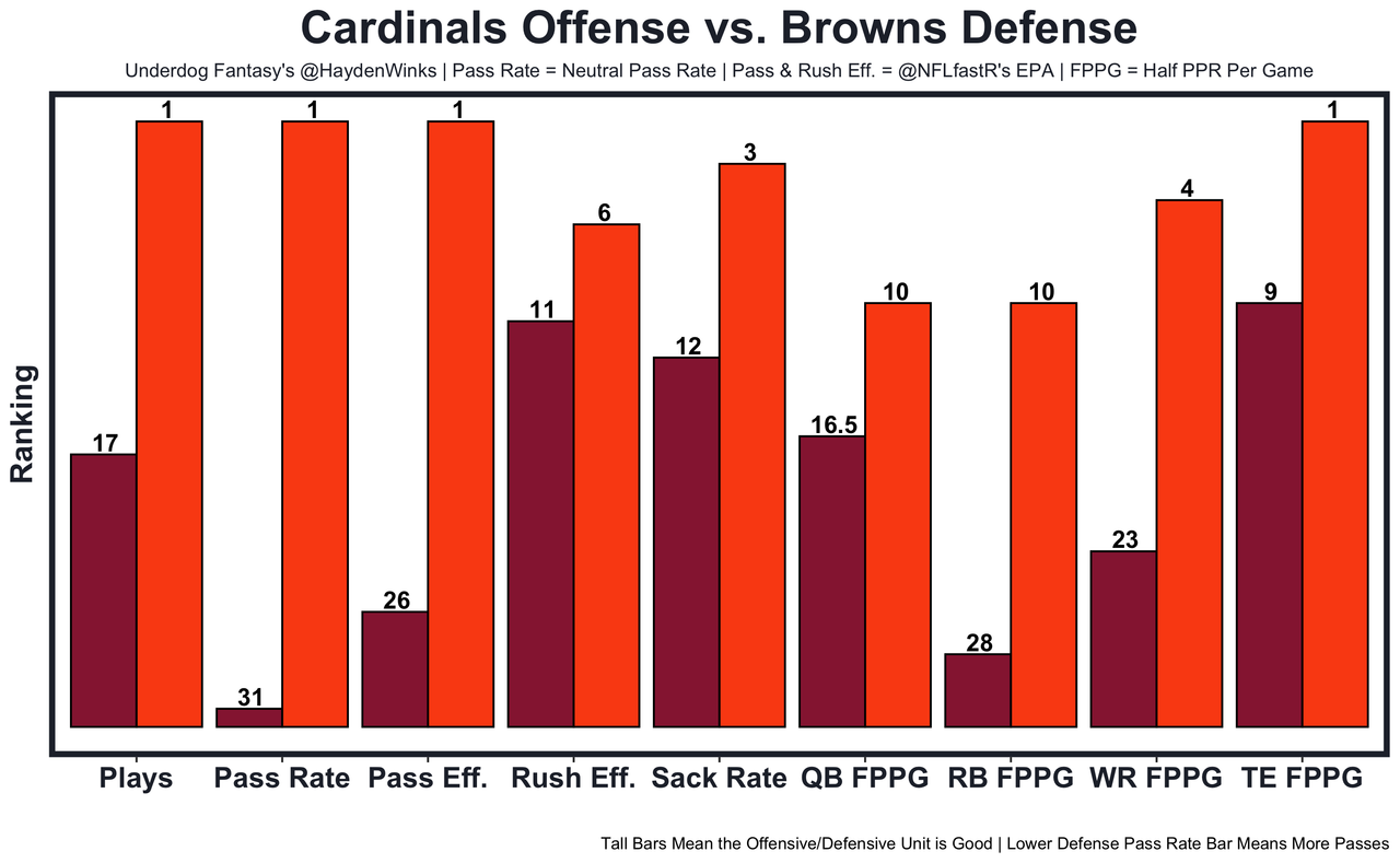 Keaontay Ingram - The Cardinals have a 15.0-point team total against the Browns No. 1 EPA allowed defense. Demercado had 11.6 and 9.7 expected half PPR points in his two starts as a potential garbage time eater, but he's out (toe). Ingram was replaced by Demercado because he's not very good (career 2.4 YPC). It'll be Tony Jones behind him.