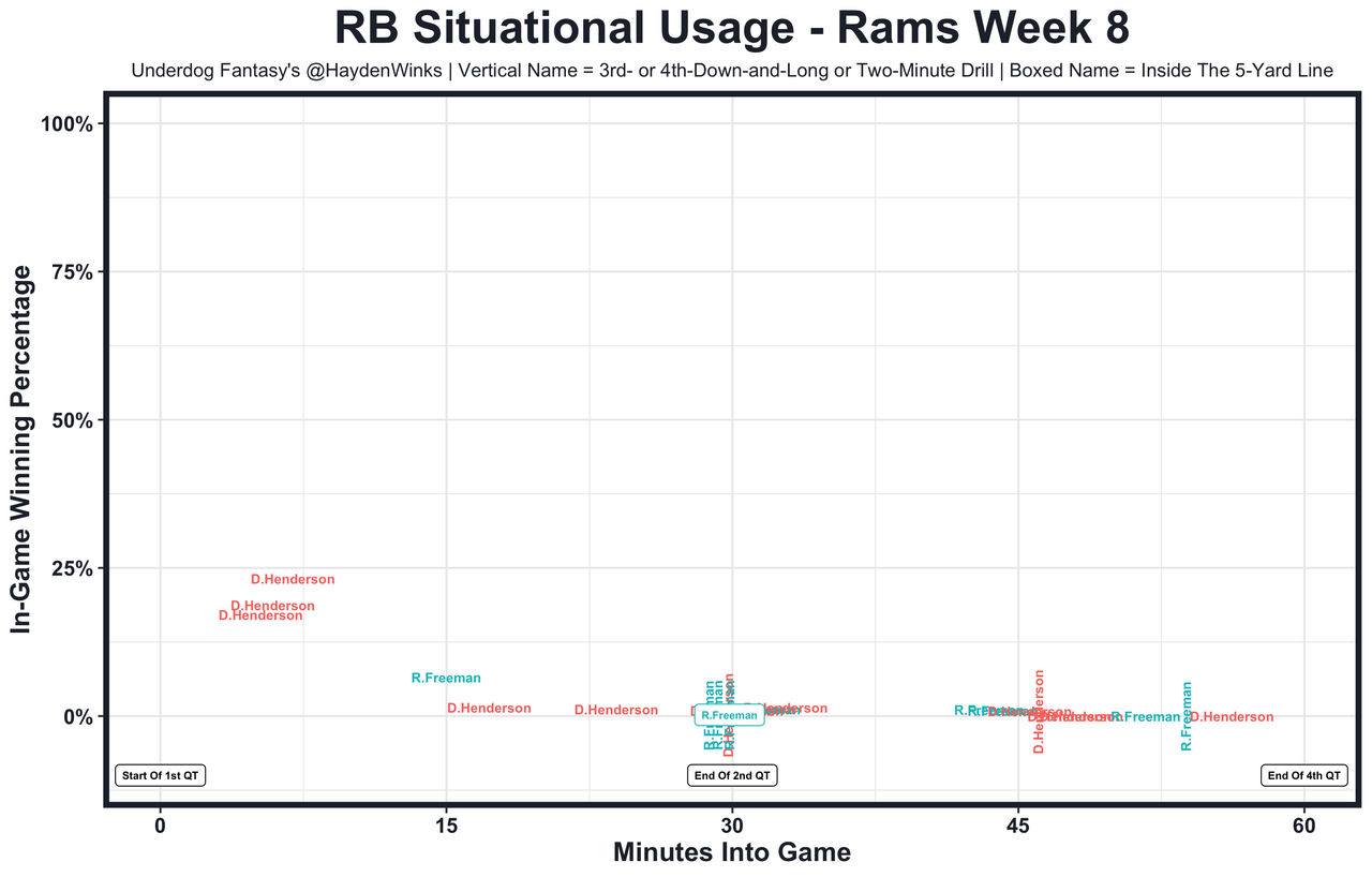 Darrell Henderson - He's the better pass catching option, but losing the goal-line carry to Royce Freeman last week was a tough pill to swallow. This offense without Matthew Stafford could be really iffy. Henderson is the better bet to PPR scam against a Green Bay defense that's 7th-worst against fantasy RBs (again).