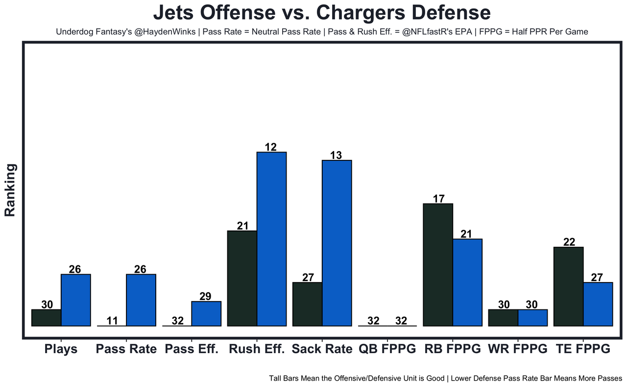 Garrett Wilson - He's the WR25 on WR7 usage this month, with a chance to hit on his role against the No. 30 fantasy WR defense. The Chargers CB room without J.C. Jackson is a total mess. 64.5 receiving yards in Pick'em.
