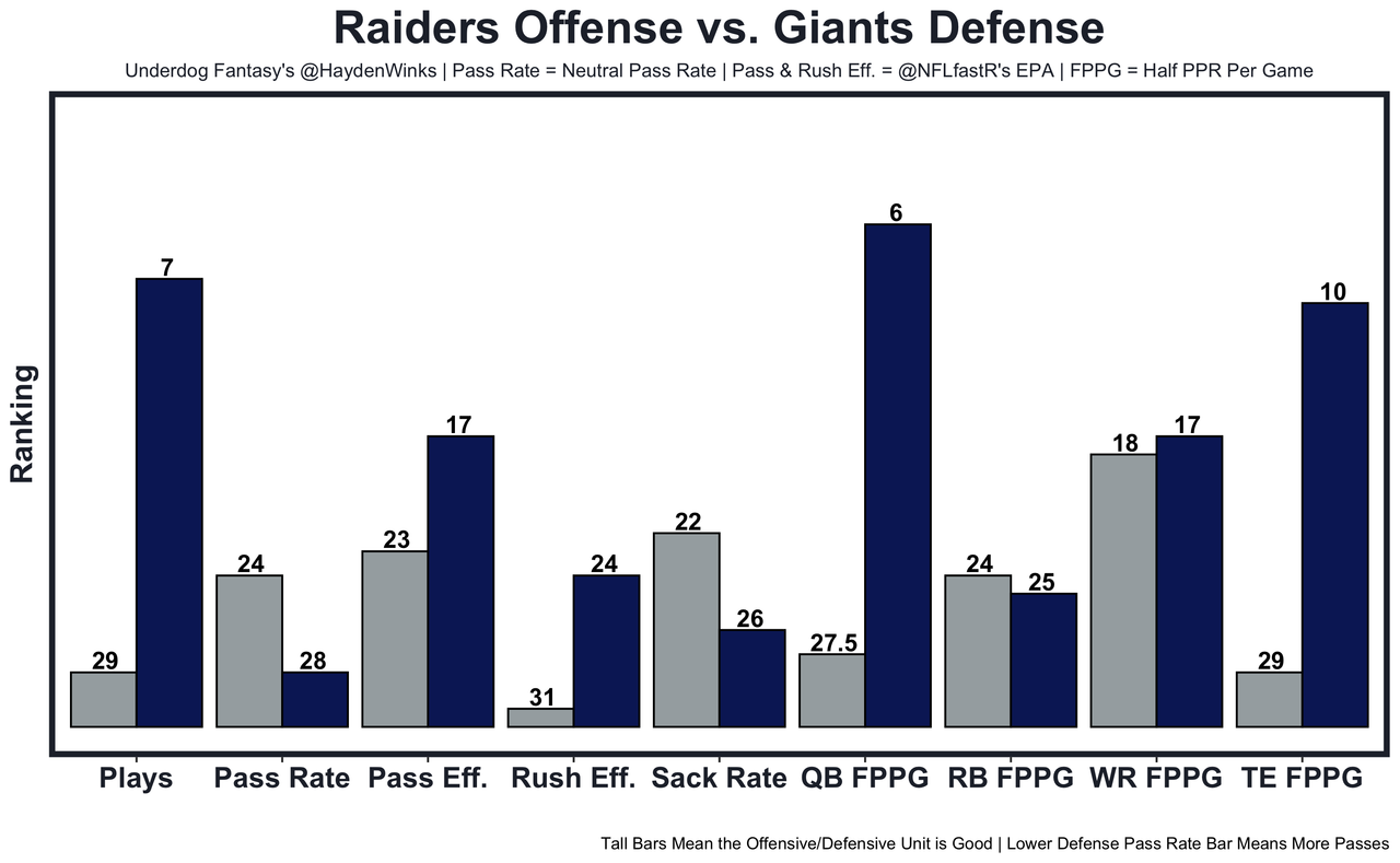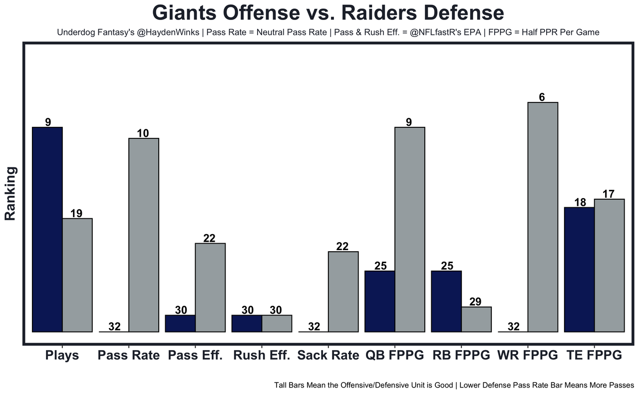 Saquon Barkley - 40-touch games are rare, and the Raiders have allowed at least 15.5 half PPR points in 3-straight games to Rhamondre Stevenson (15.5), D'Onta Foreman (31.5), and Jahmyr Gibbs (27.4). Vegas, who is on a short week with East-to-West travel was on the field for 81 plays last Monday. Hopefully Daniel Jones and LT Andrew Thomas are actually back this week. 16.45 fantasy points in Pick'em.