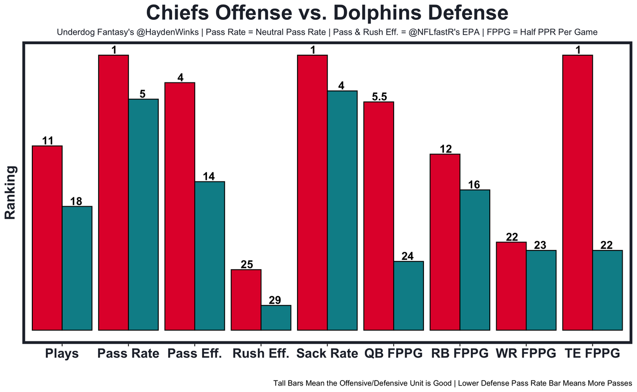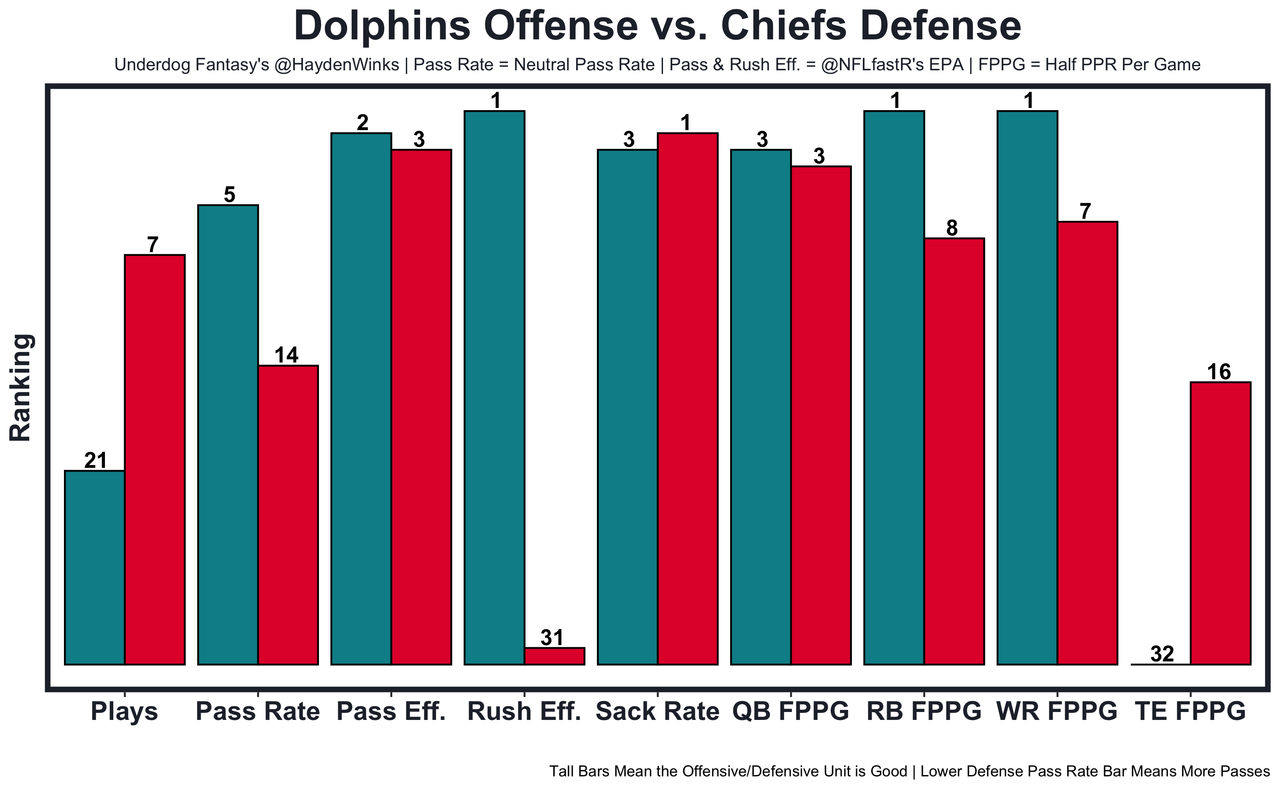 Isiah Pacheco - He's coming off a season-low 7.9 expected half PPR points in a rare decisive loss, but the Chiefs aren't often in that game script. They're 2.5-point home favorites against the Dolphins, who are middle of the pack in all rushing metrics. 12.65 fantasy points in Pick'em.
