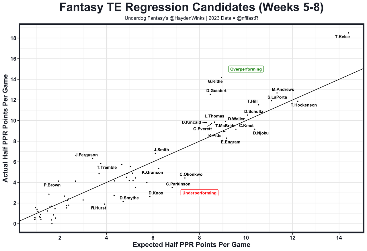 Travis Kelce - The only metric that is down for Kelce in 2023 is his broken tackle rate, but that hasn't stopped him from a career-high 2.7 yards per route run. That's a function of a never-ending brutal WR group. Kelce is averaging a 7.7 receptions per game.