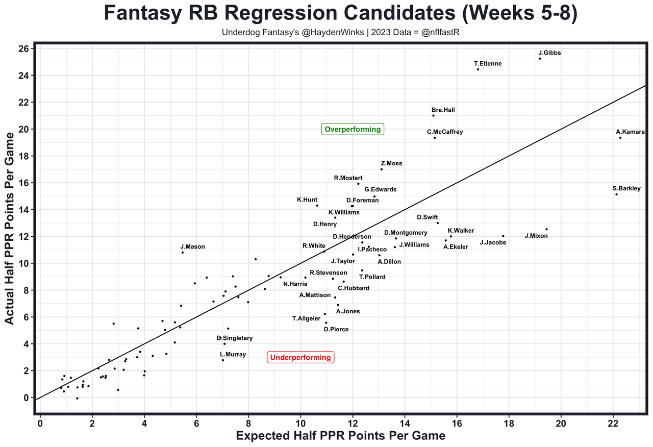 Brian Robinson - We've entered the "TD Prayer Range" of rankings. The Commanders have rightfully abandoned the run (3rd in neutral pass rate this month) and have mixed in Robinson's backups from time to time. Robinson needs positive game scripts and goal line carries to hit home, and Washington is literally tanking. He hasn't hit 10.0 expected half PPR points since Week 4. Perhaps he waltzes into the end zone against the Patriots. 8.05 fantasy points in Pick'em.