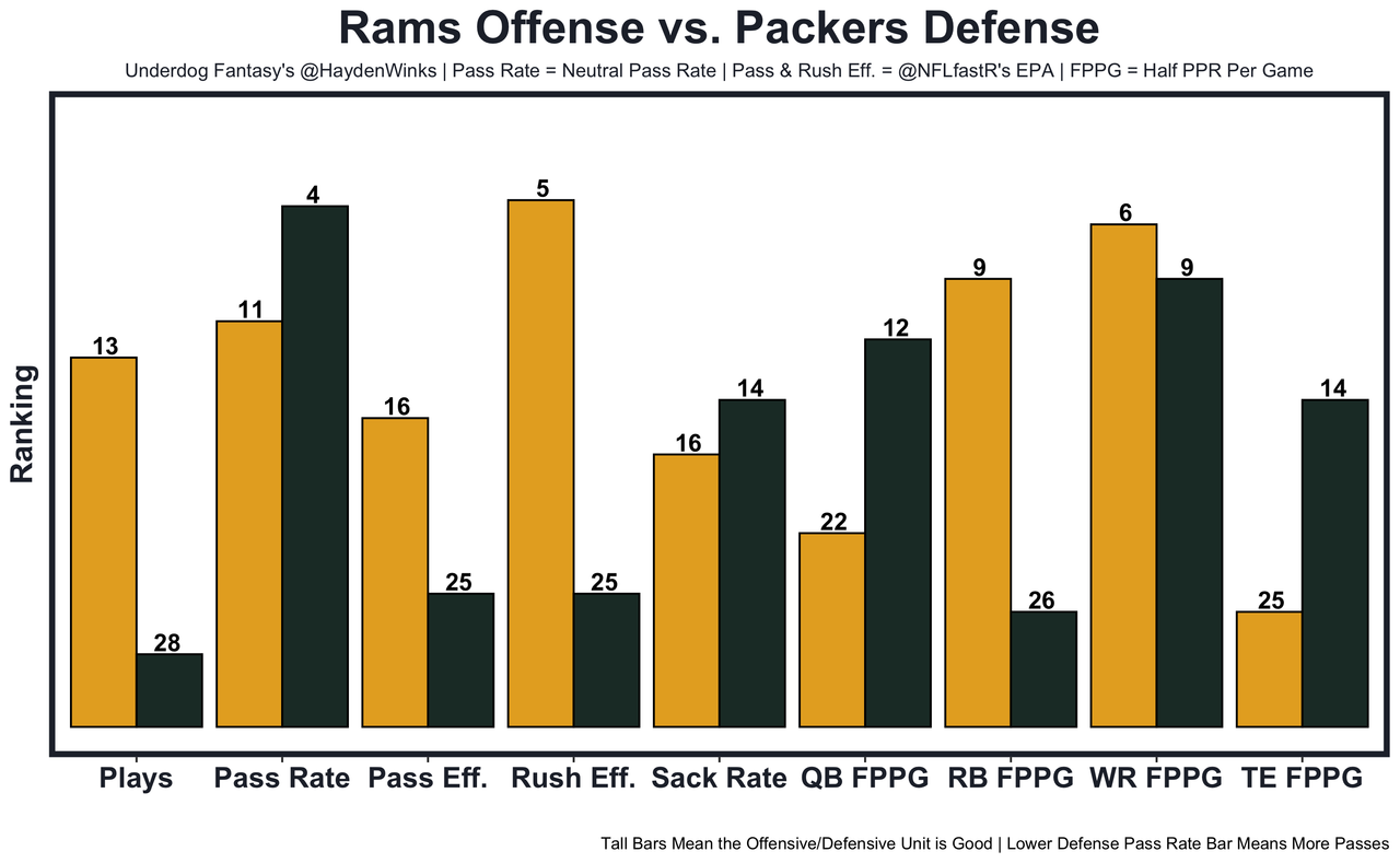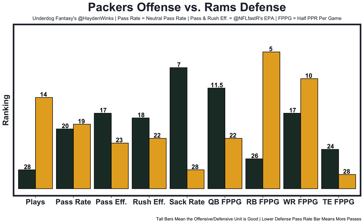 The Packers have S Darnell Savage and CB Eric Stokes on injured reserve, then traded CB Rasul Douglas at the trade deadline. Before all that, Green Bay was 25th in both passing and rushing EPA allowed, despite getting a monster season from EDGE Rashan Gary. If Stafford (sprained right thumb) can't play as expected, it'll be Brett Rypien in Lambeau.