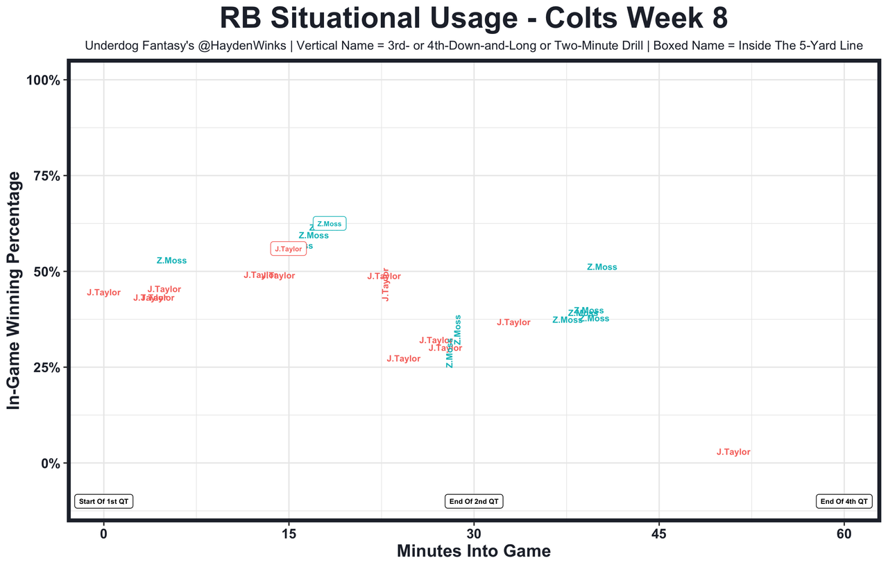 Zack Moss - He's had 12.9, 10.0, and 10.2 expected half PPR points with Jonathan Taylor involved, and remains a factor at the goal line. They split the inside the 5-yard line opportunities last week, even with Moss downgrading to 35% snaps. Let's monitor Taylor's practice reps this week after battling a lower-leg issue in the 2nd half last week. The Colts' 7th-highest team total of the week could lead to both paying off again. 54.5 total yards in Pick'em.