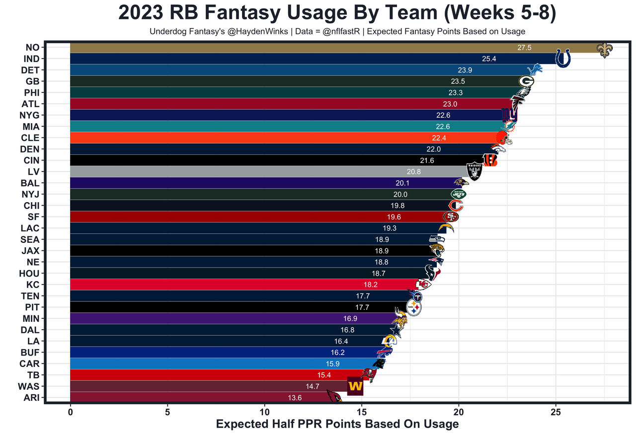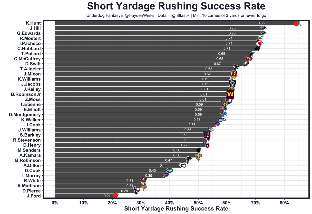 Kareem Hunt - The leader in short-yardage success rate, Hunt has established himself as the preferred goal line back ahead of Jerome Ford who is last in that same metric. Hunt has goal line opportunities waiting with the Browns ranking 5th in implied points against a Cardinals defense that is one of four units to allow 12 TDs to opposing RBs. He's eclipsed 10.0 expected half PPR points in all 3 games out of the bye. Hopefully Cleveland removes Pierre Strong from the rotation.