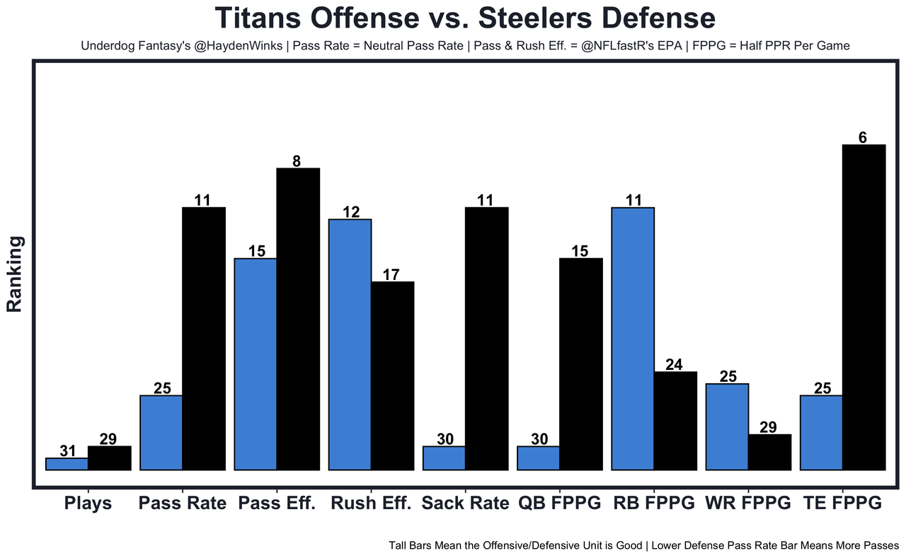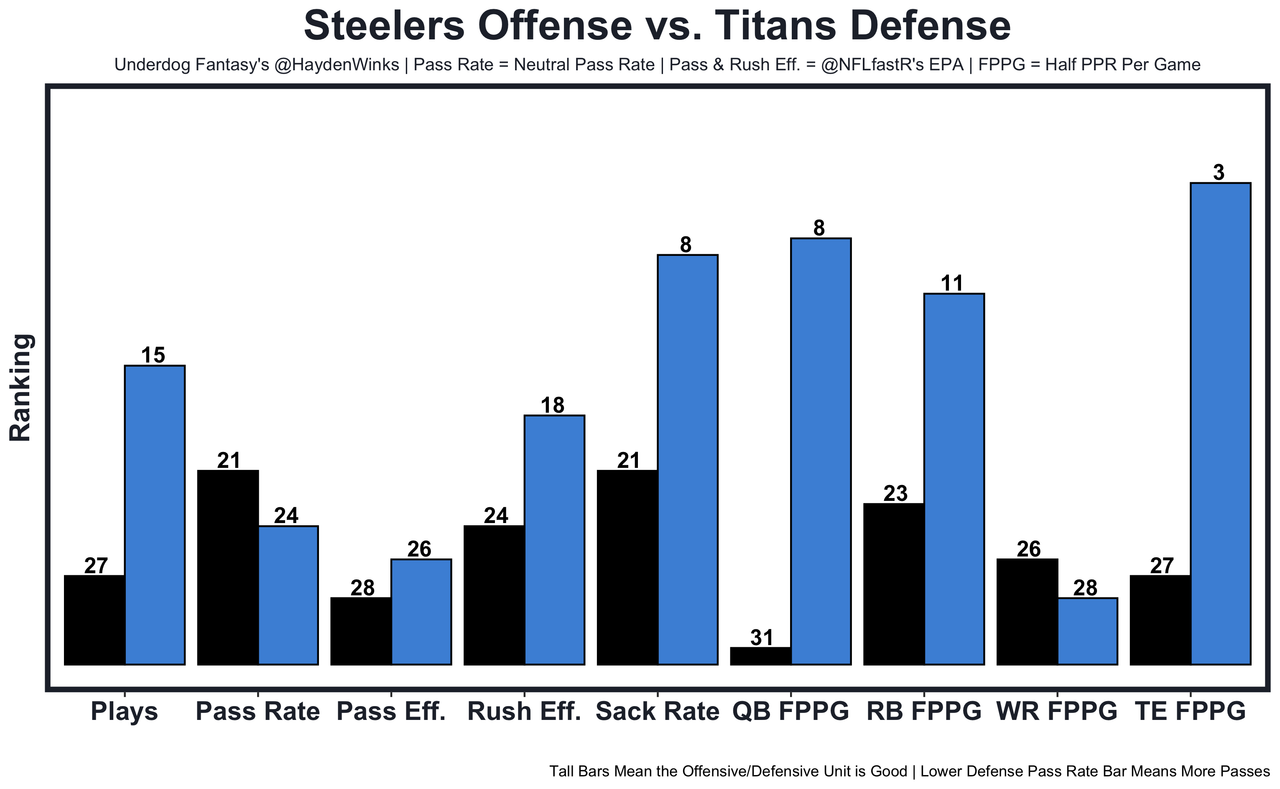 The usual pass-funnel Titans are without star S Kevin Byard (trade), backup S Mike Brown (ankle), and CB Roger McCreary (hamstring). There should be advantageous looks for this emerging WR duo if Pickett can stay protected against the No. 8 sack rate defense. 15.15 fantasy points in Pick'em.