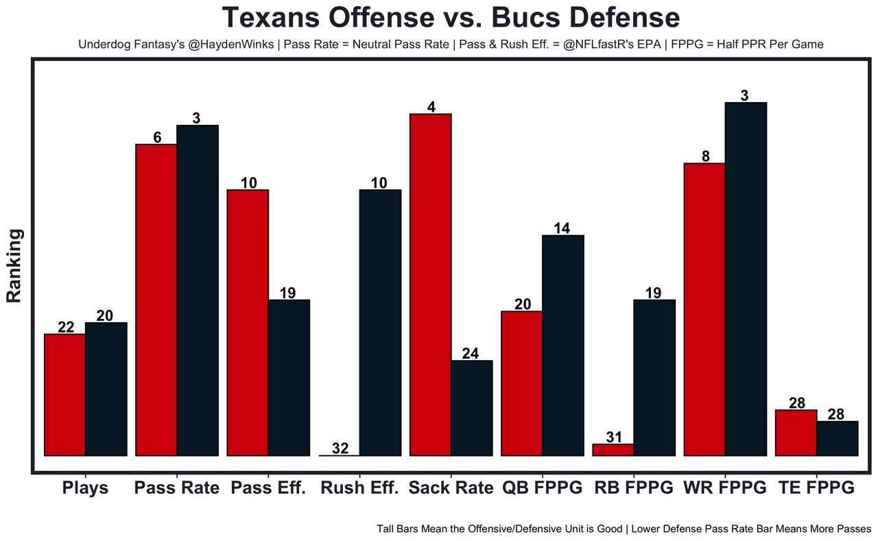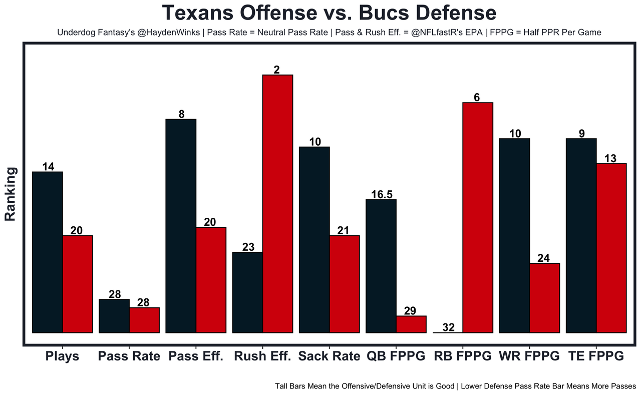 Nico Collins - He's had 13.2 half PPR on 9.4 expected half PPR this year, but things have been dry recently. If Dameon Pierce (DNPx2) misses, there's no excuse to run as much as the Texans have recently. A Bucs pass funnel (24th vs. fantasy WRs) is the perfect time to sling the rock around. 59.5 receiving yards in Pick'em.