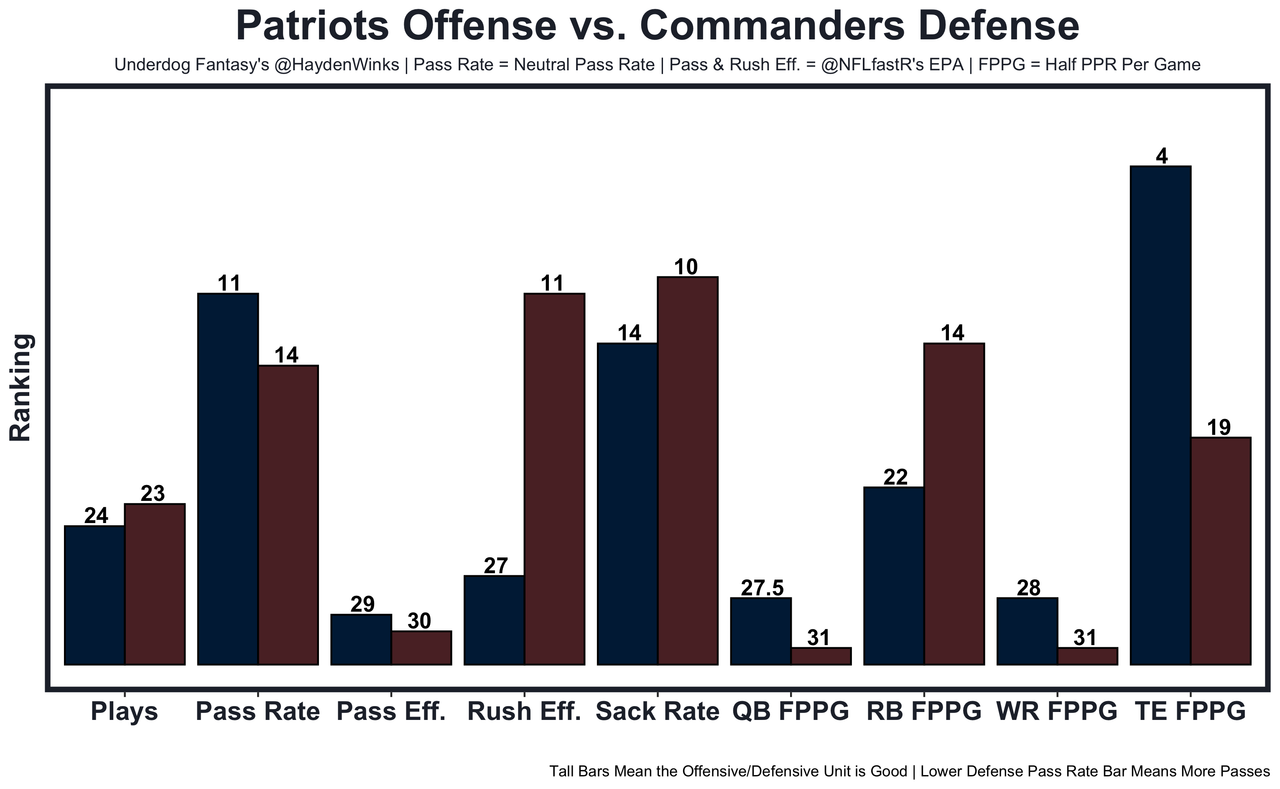 Rhamondre Stevenson - He's had 15.3, 13.2, and 12.1 expected half PPR points since the offense adapted their offense to Mac's strengths. Last week, Stevenson handled 12.1 of the 15.0 expected half PPR points to the Patriots RBs, so his share is widening from Ezekiel Elliott and there could be even more targets to this duo with "Pop Douglas" and "Jalen Reagor" as the top "WRs". With the Commanders in full tank mode without EDGEs Young and Sweaty, New England is the proud owners of a 22.0-point team total (11th highest). The ball is going to Mondre. Buy. 11.75 fantasy points in Pick'em.