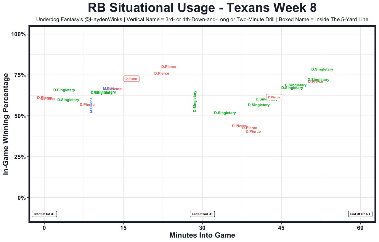 Devin Singletary - Dameon Pierce (ankle) is out. He was the RB28 in usage this past month while splitting time with Singletary, who will inherit the goal line role as Mike Boone and Dare Ogunbowale are change-of-pace guys only. Singletary and Pierce have combined for 18.4 expected half PPR points per game, though they've been under performers all year long with a brutal iOL. 65.5 total yards in Pick'em.