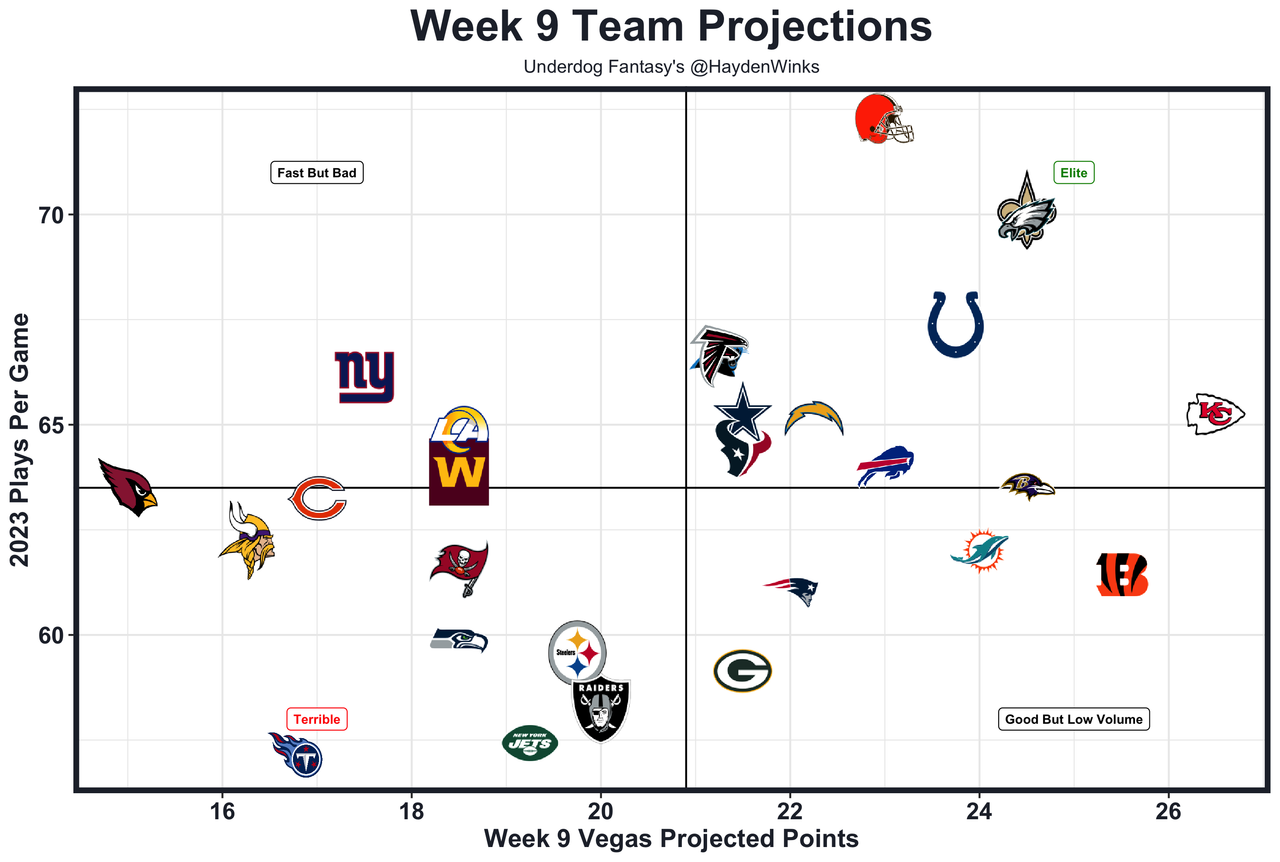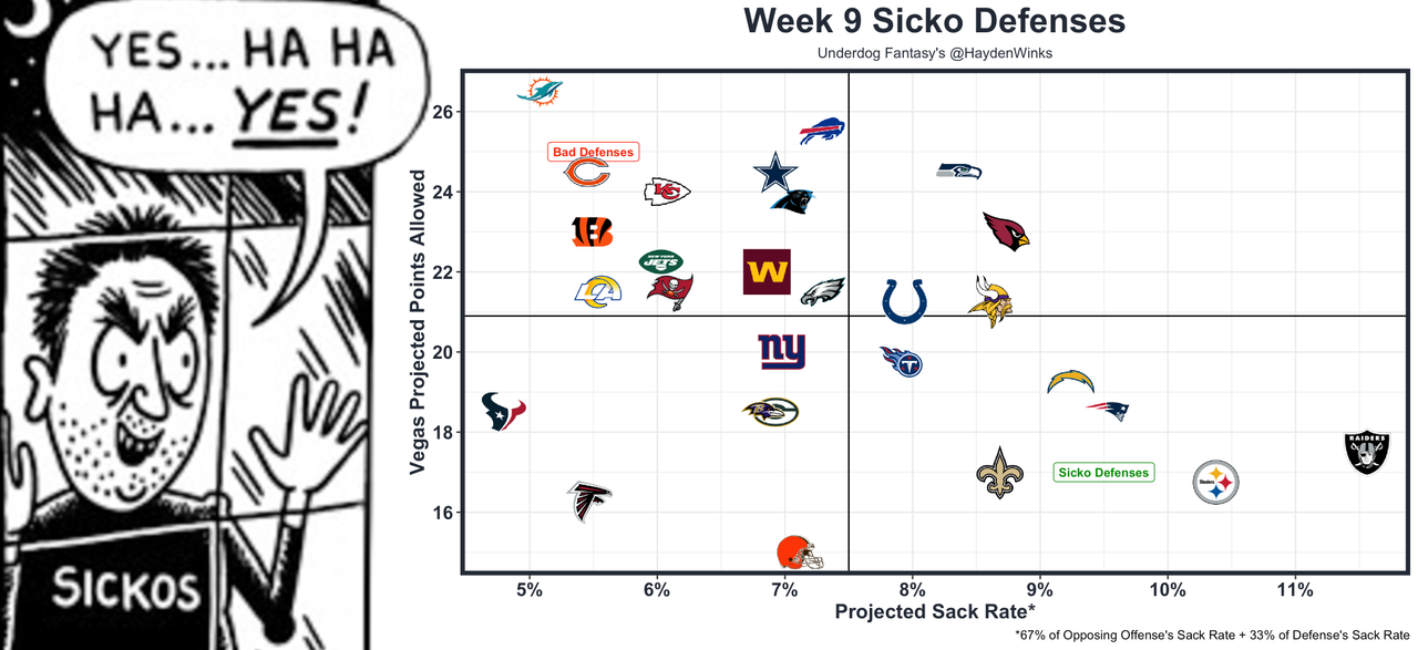 The fantasy football defenses of Week 9 are the Browns (vs. ARI), Steelers (vs. TEN), Saints (vs. CHI), Raiders (@ NYG), Patriots (vs. WAS), Chargers (@ NYJ), and Falcons (vs. MIN).