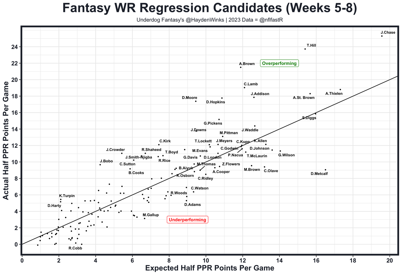 Elijah Moore - He has a 24% target share with Deshaun Watson this year. Moore is a positive regression candidate, especially with the Donovan Peoples-Jones trade lessening target competition.