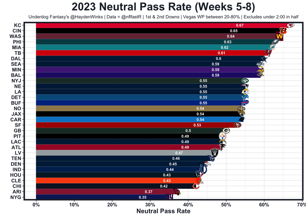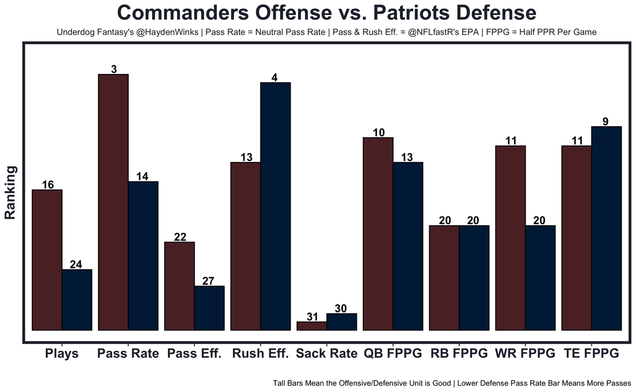 Terry McLaurin - The Commanders are 3rd in neutral pass rate, helping McLaurin climb to WR14 in usage this month. This assumes Curtis Samuel is out, which has forced more targets to McLaurin and Dotson. New England is just 20th against fantasy WRs and 27th in passing EPA allowed. 61.5 receiving yards in Pick'em.