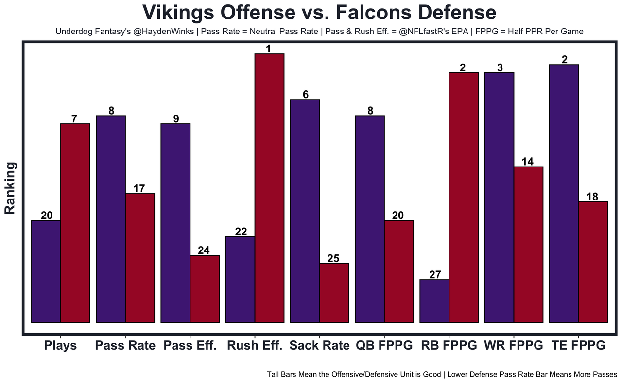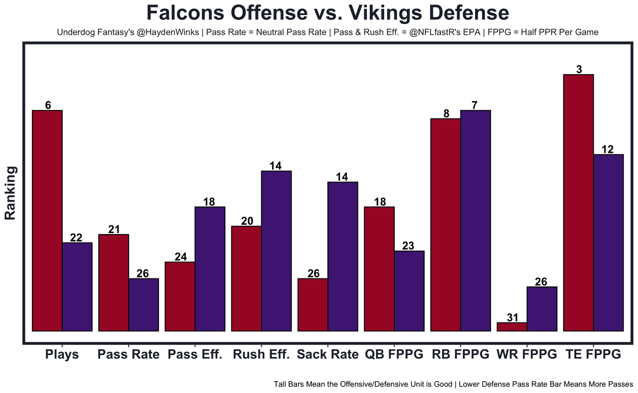 Kyle Pitts - He's the TE12 in usage this month with a couple things working in his favor. Heinicke is more likely to throw things up to his studs (see: 2022 Washington) than Ridder was, and Drake London (groin) is out. Atlanta has an average 21.0-point team total against the Vikings' mediocre defense. 42.5 receiving yards in Pick'em.