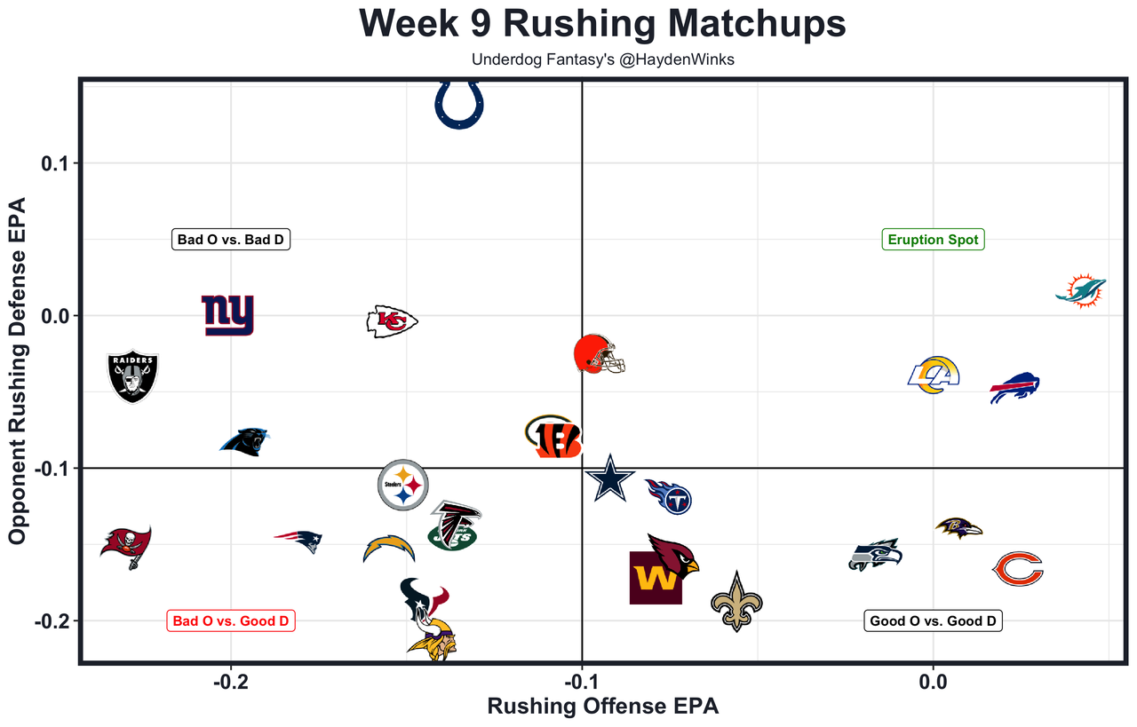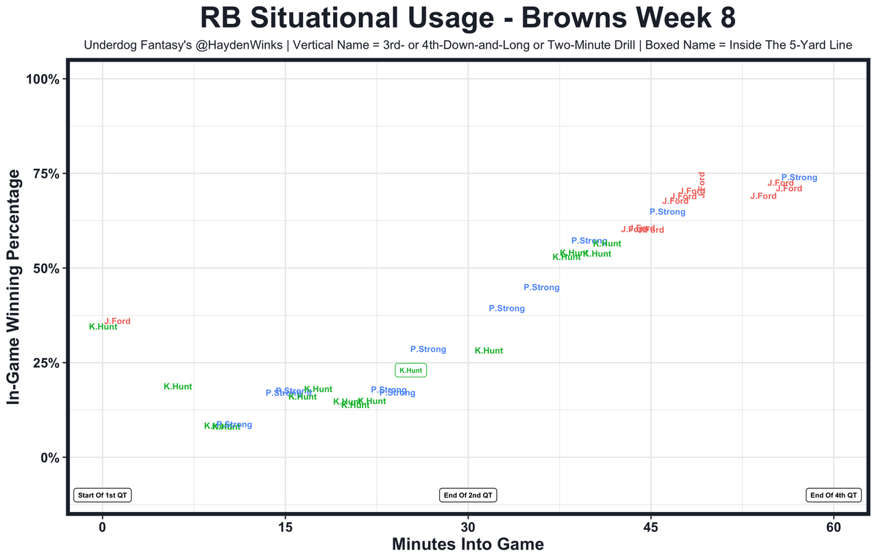 Jerome Ford - Was he healthy? Not really. But Ford did play a lot when it mattered most for the Browns last week. He's capable of ripping off big plays, but he's lost the short-yardage role to Hunt based on their performance's and he's been limited to 9.0 expected half PPR points in their 5 games together. Still, Cleveland is projected for the 5th-most points this week.