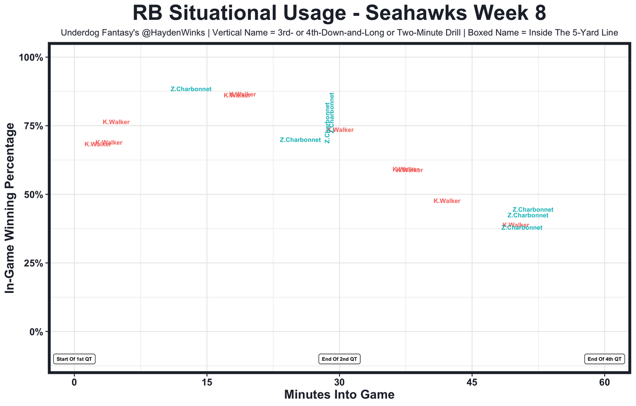 Kenneth Walker - He was listed on the injury report (calf) last week, leading to fewer snaps than normal. Zach Charbonnet is trusted by the Seahawks coaching staff and is a strong Post Bye Rookie Bump candidate as Walker's complement on passing situations. Walker's season-low 6.1 expected half PPR points last week is a scary development, but he also looked really good still. The Seahawks (18.5 implied points) run into another tough matchup in Baltimore here. 9.55 fantasy points in Pick'em.