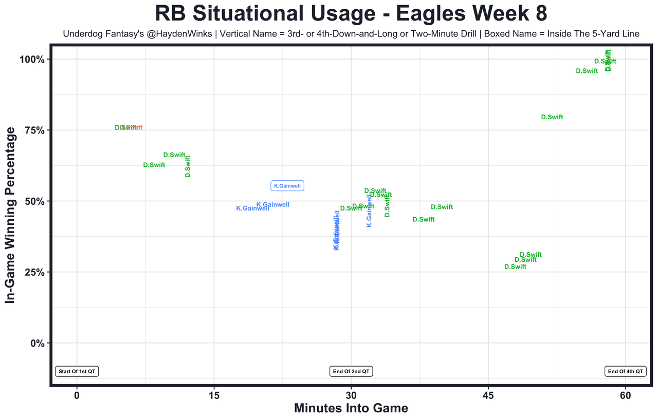 D'Andre Swift - He's at 16.1 expected half PPR points since being the 1a to Kenny Gainwell, who fumbled his lone goal line rep last week. Hopefully that goes to Swift this week because he'll need high-value touches against the Cowboys' 3.6 YPC defense. 11.85 fantasy points in Pick'em.