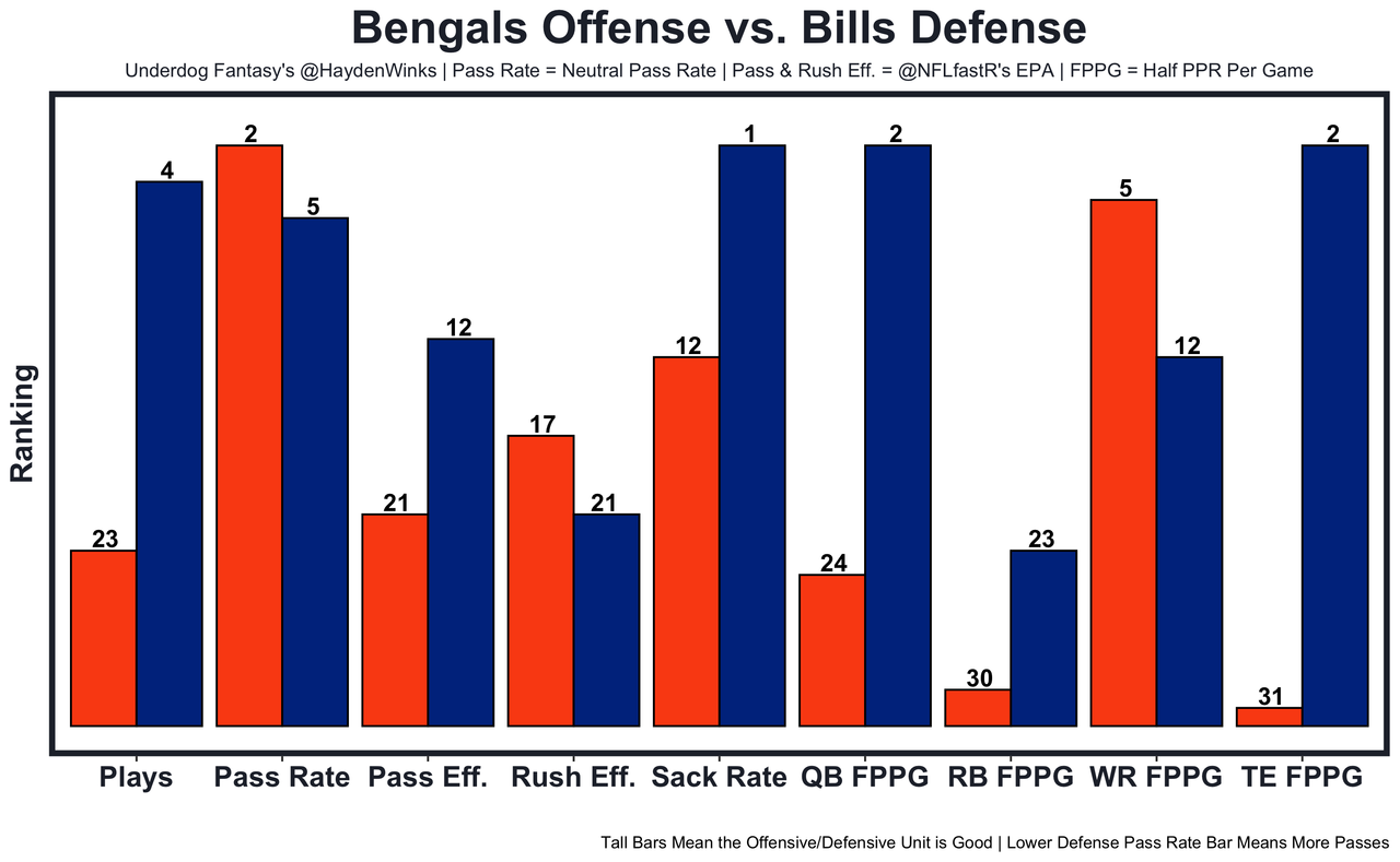 As a reminder, this month the Bills have placed DT DaQuan Jones, LB Matt Milano, and CB1 Tre'Davious White on injured reserve. They're not the elite defense they could've been, and Burrow is coming off his best game of the year. By far. He looked way healthier (even scrambling) and has his skill group fully healthy. The Bengals are back to having the 2nd-highest team total of the week in a potential shootout with the fast-paced Bills. Burrow had 242-2-0 passing against Buffalo in last year's road playoff win. 18.75 fantasy points in Pick'em.