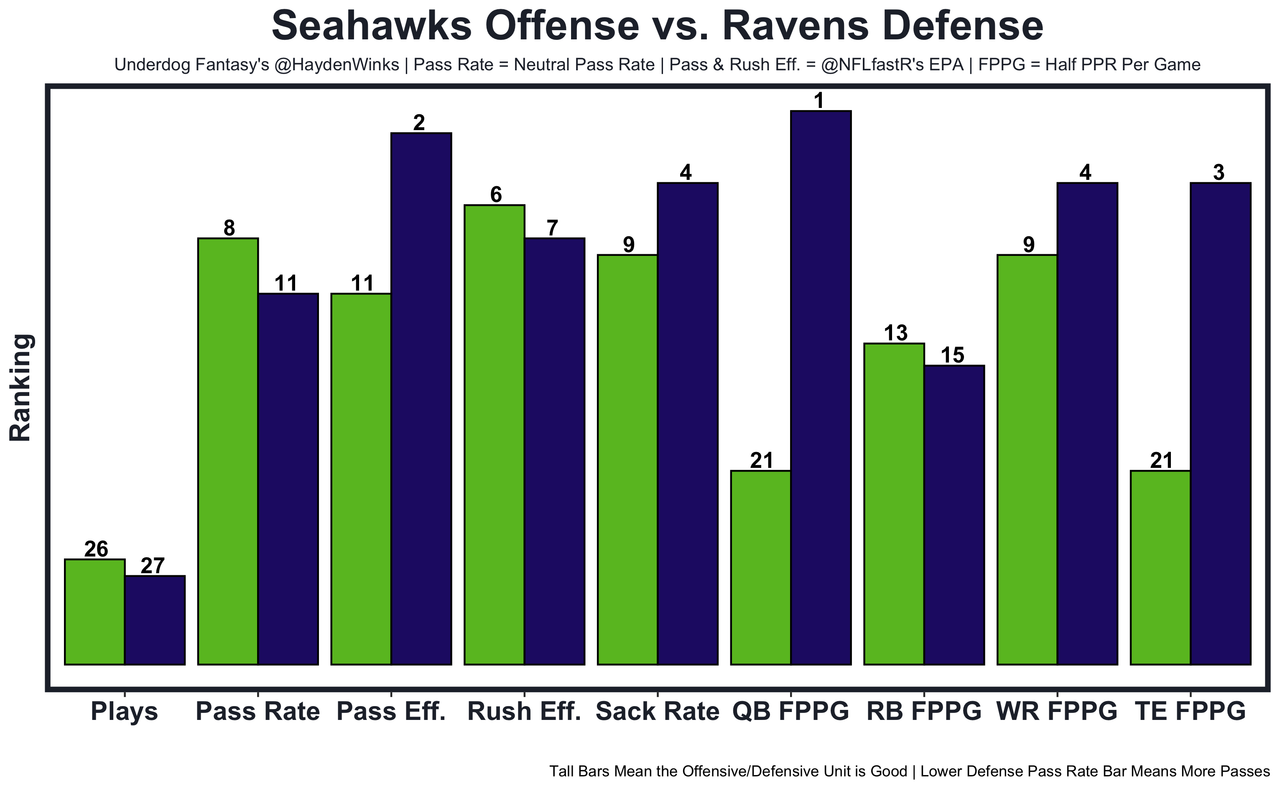 The Seahawks defense has allowed 5.3 yards per dropback with 1st-round rookie CB Devon Witherspoon on the field and 4.8 yards per dropback with star S Jamal Adams on the field. Seattle's defense has been on fire recently, but it's also been against P.J. Walker, Josh Dobbs, an injured Joe Burrow, and Daniel Jones. Safe to say Lamar is multiple tiers better. 20.45 fantasy points in Pick'em.