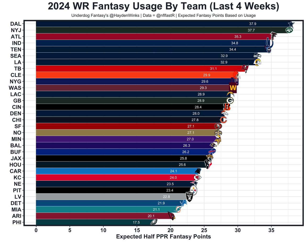 The volume is simply not there with the Eagles rushing the ball in neutral situations at the highest rate, but Smith is also so good that he can still get home on average. This month, he's the WR24 on WR77 usage, making him one of the most boom-bust fantasy assets.