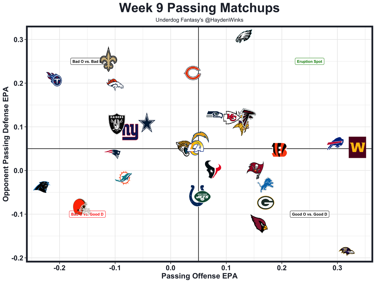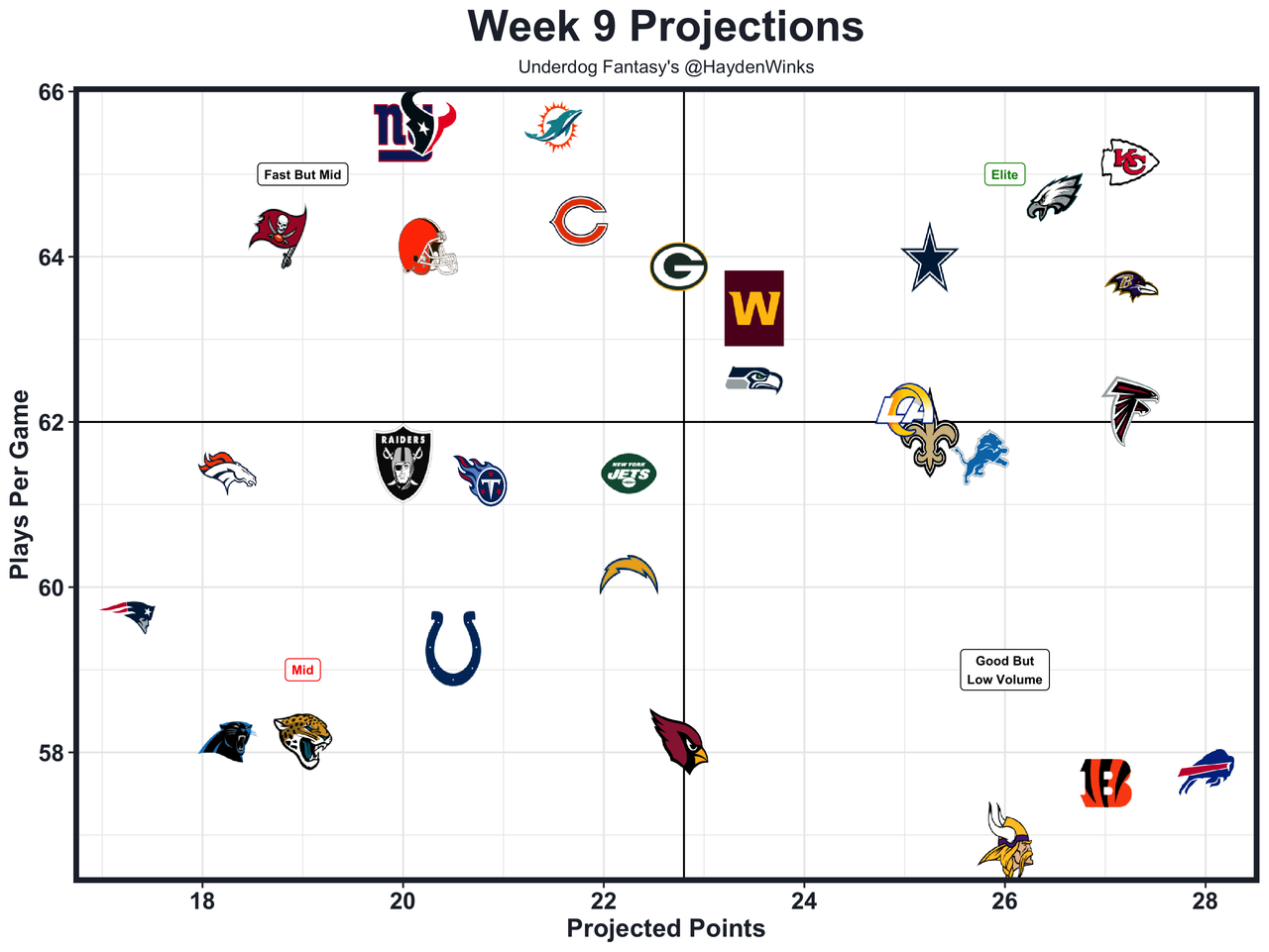 I'm expecting more 2-TE sets to help the pass protection and a healthy staple of deep play action shots, simply because it plays best with their available personnel sans Nico Collins (back in Week 10) and Stefon Diggs (IR). Thus far, Dell hasn't been used that way, possibly because he's not as fast as he was before his broken leg.