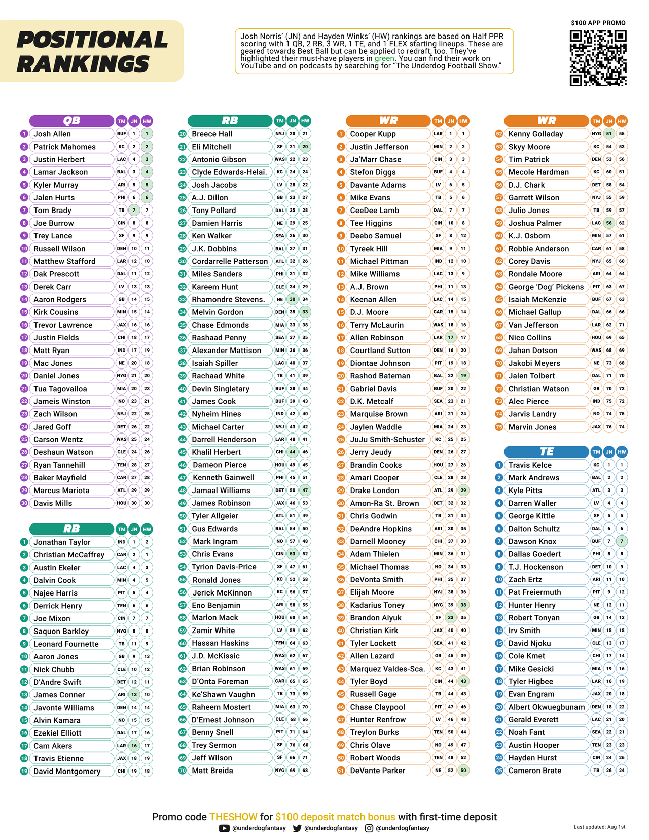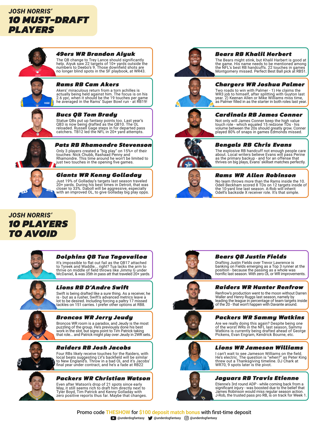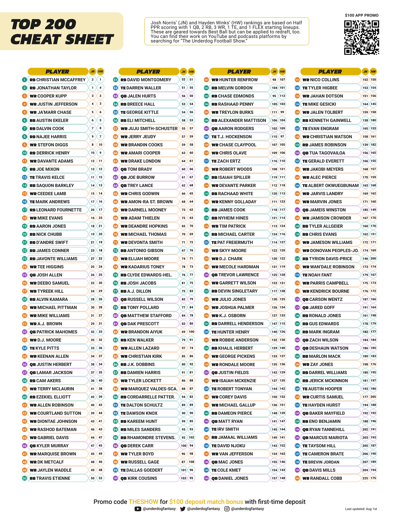 The Underdog Football Show's FREE printable draft guide is here. Josh Norris and Hayden Winks will update their fantasy football rankings, target players, busts, and ideal drafts throughout August and early September as they grind the news and preseason tape. Their last update was on August 1st. Enjoy!