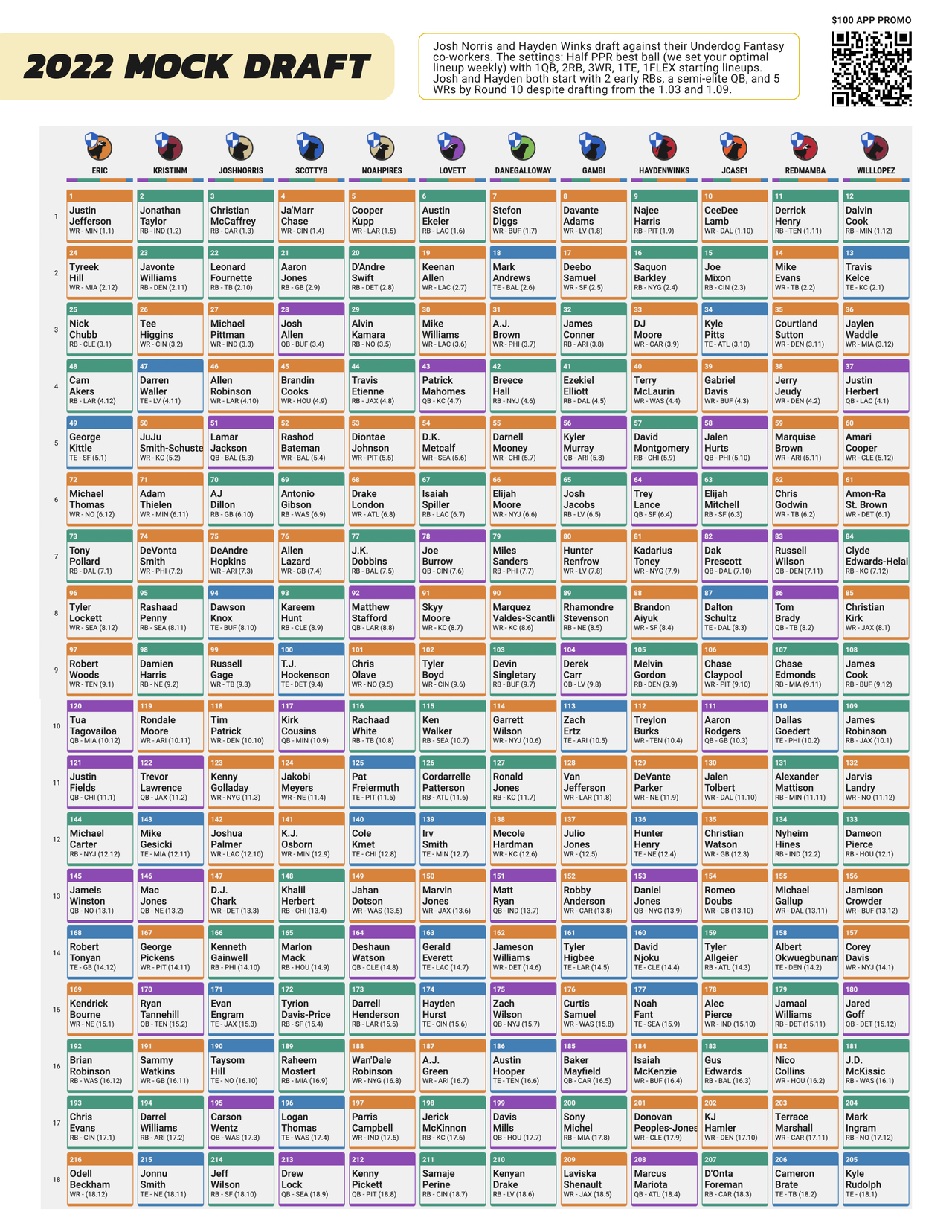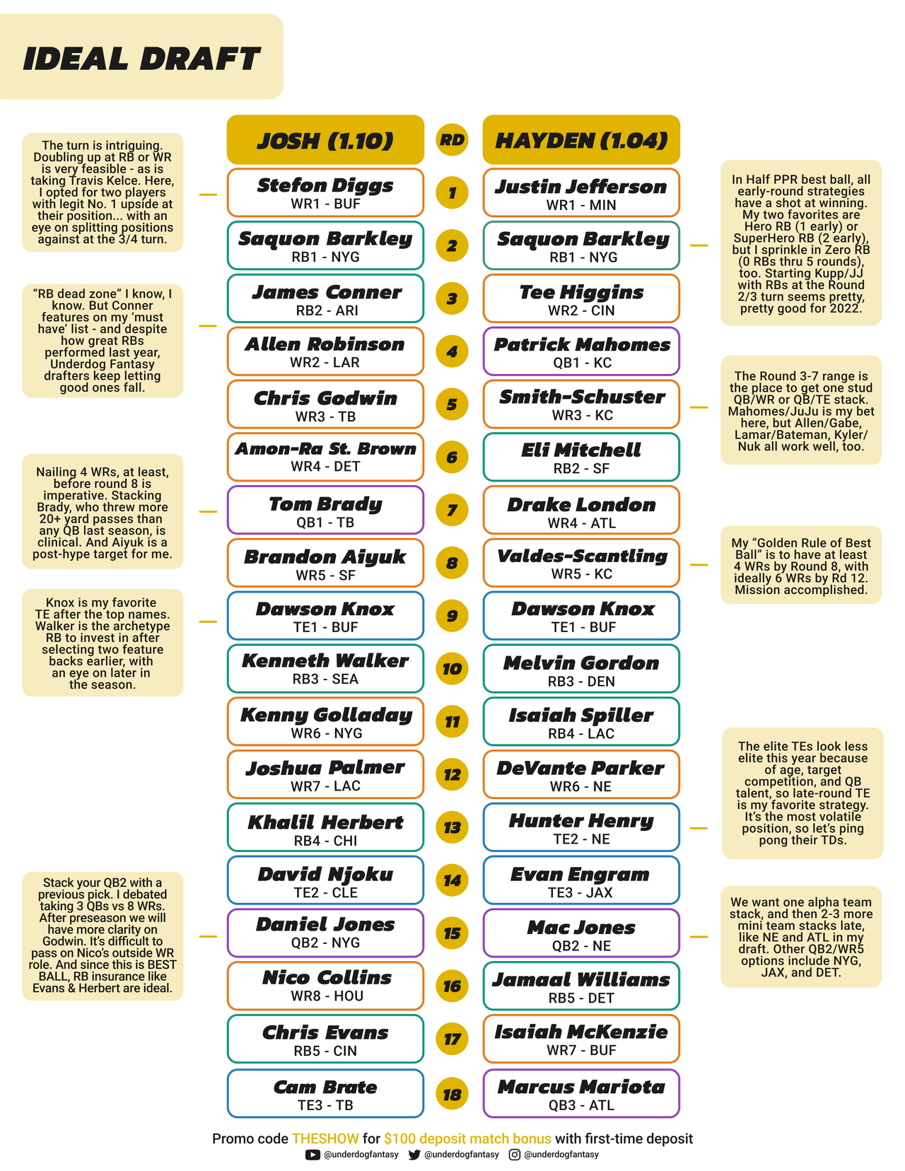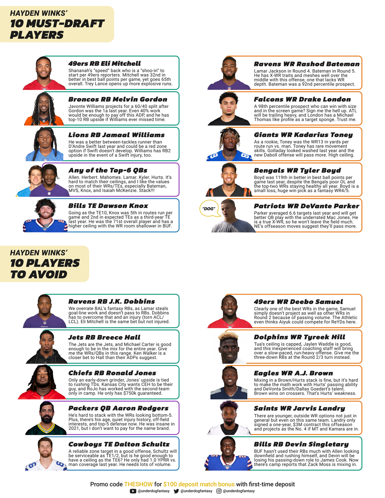 The Underdog Football Show's FREE printable draft guide is here. Josh Norris and Hayden Winks will update their fantasy football rankings, target players, busts, and ideal drafts throughout August and early September as they grind the news and preseason tape. Their last update was on August 1st. Enjoy!