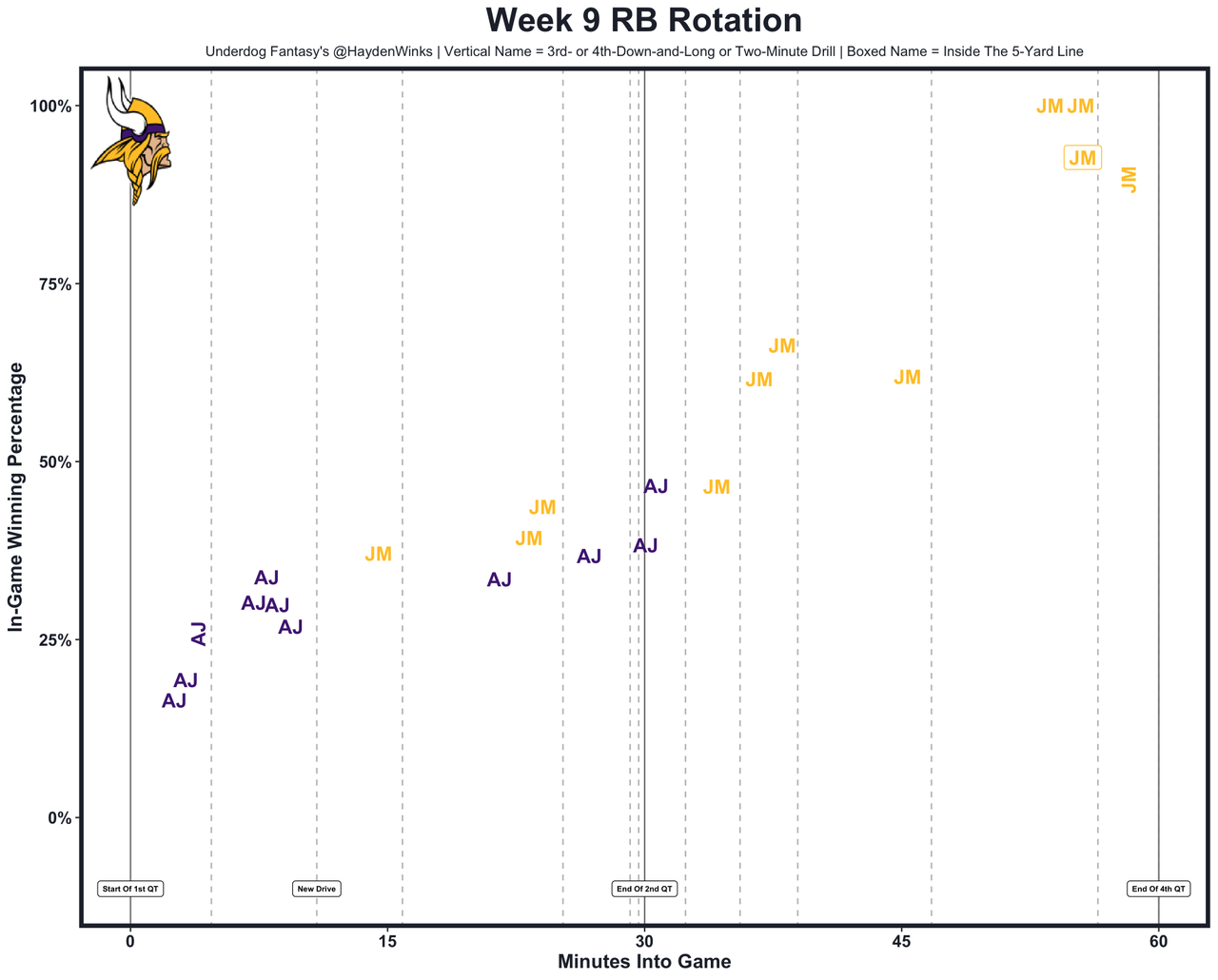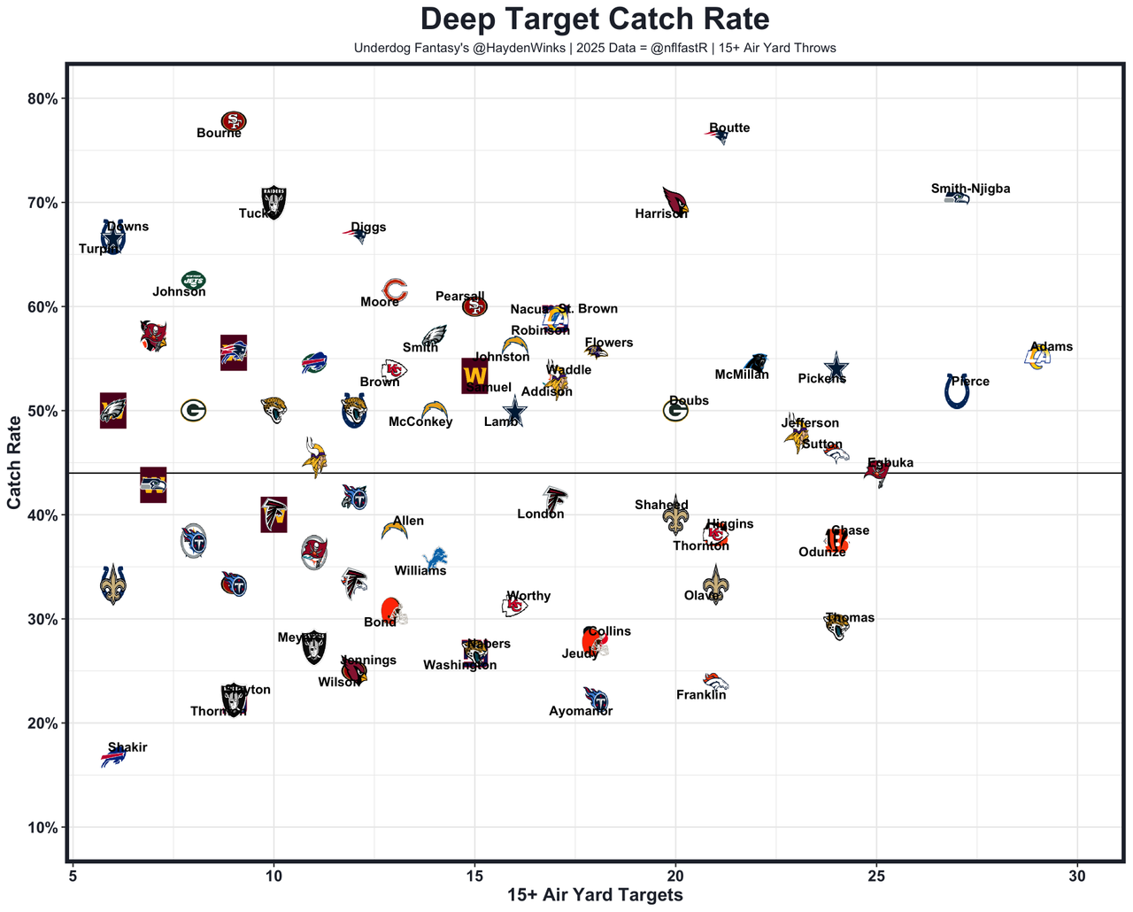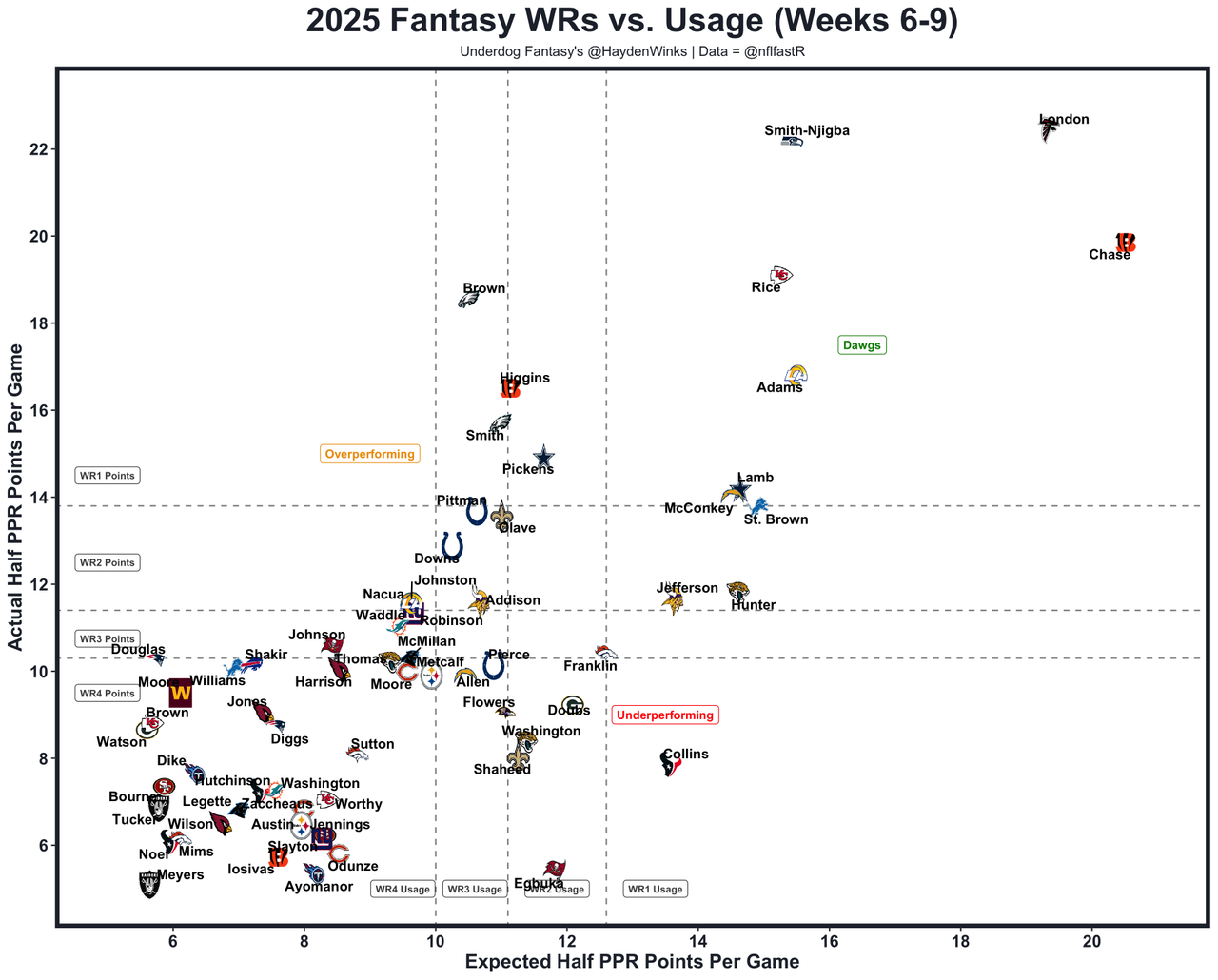 He's the WR21 on WR25 usage this month, and it's starting to tank a bit. Over the last two weeks, Addison has had 6.2 and 7.2 expected half PPR points. That's WR57 usage if it holds with JJ McCarthy, who had a gutsy win and some nice throws but also struggled with accuracy and was playing erratically for half of his reps. Addison faces a legit battle with CBs Nate Wiggins and Marlon Humphrey.