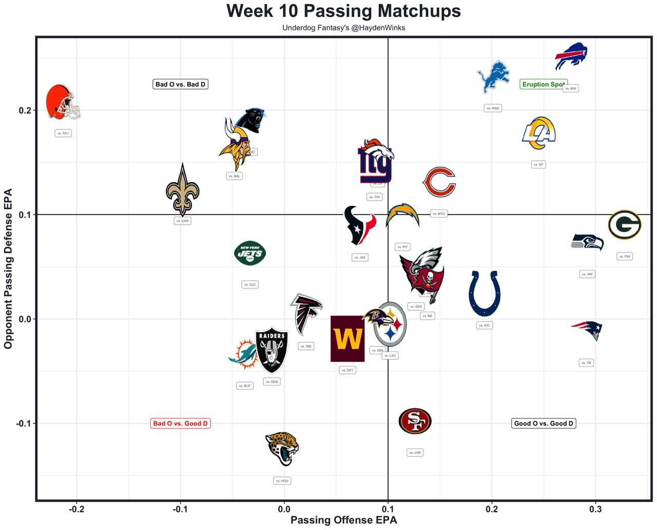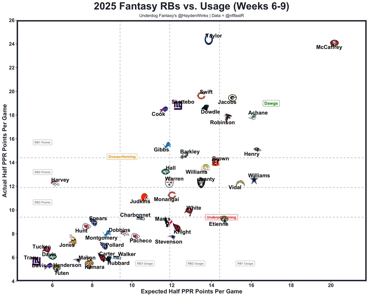 He's the WR59 on WR5 usage this month, as the most obvious positive regression candidate in the history of The Blueprint column. No Mike Evans (IR) and Chris Godwin (DNP on Wednesday) solidify an elite role on an offense projected for 25.5 points. Egbuka has recently been missed on the post routes that he was lights out on during his September heater. That will even out over the next month. This year, he's averaging 14.4 half PPR points on 12.4 expected half PPR points. That's a low-end median projection for him right now given the WR injuries.