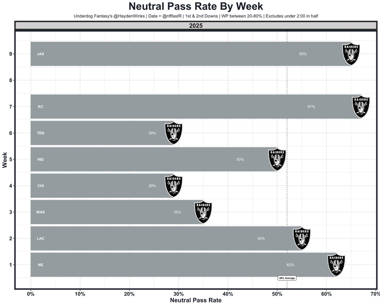 He's the RB19 on RB43 usage this month, operating as the Broncos' Joker in an impactful and fun but limited role behind Dobbins. This is a week where a couple manufactured touches could pay off. The Broncos are 7th in projected points this week (25.75) at home against the Raiders. They've been struggling after contact recently, and many play-callers are running outside away from Maxx Crosby.