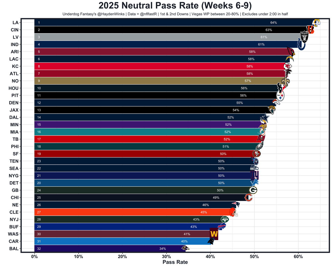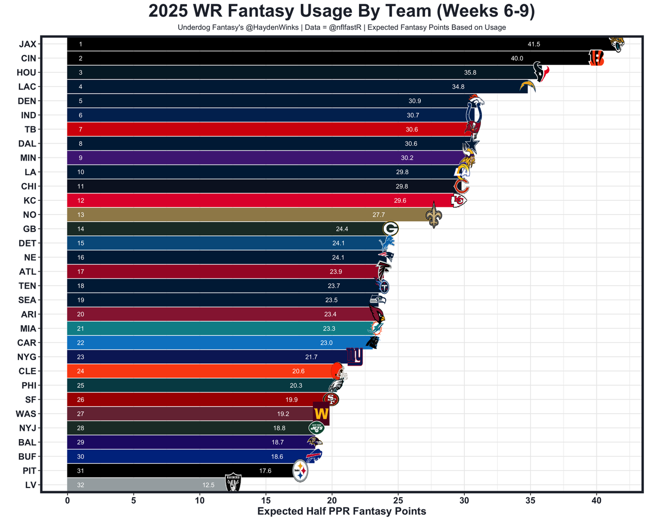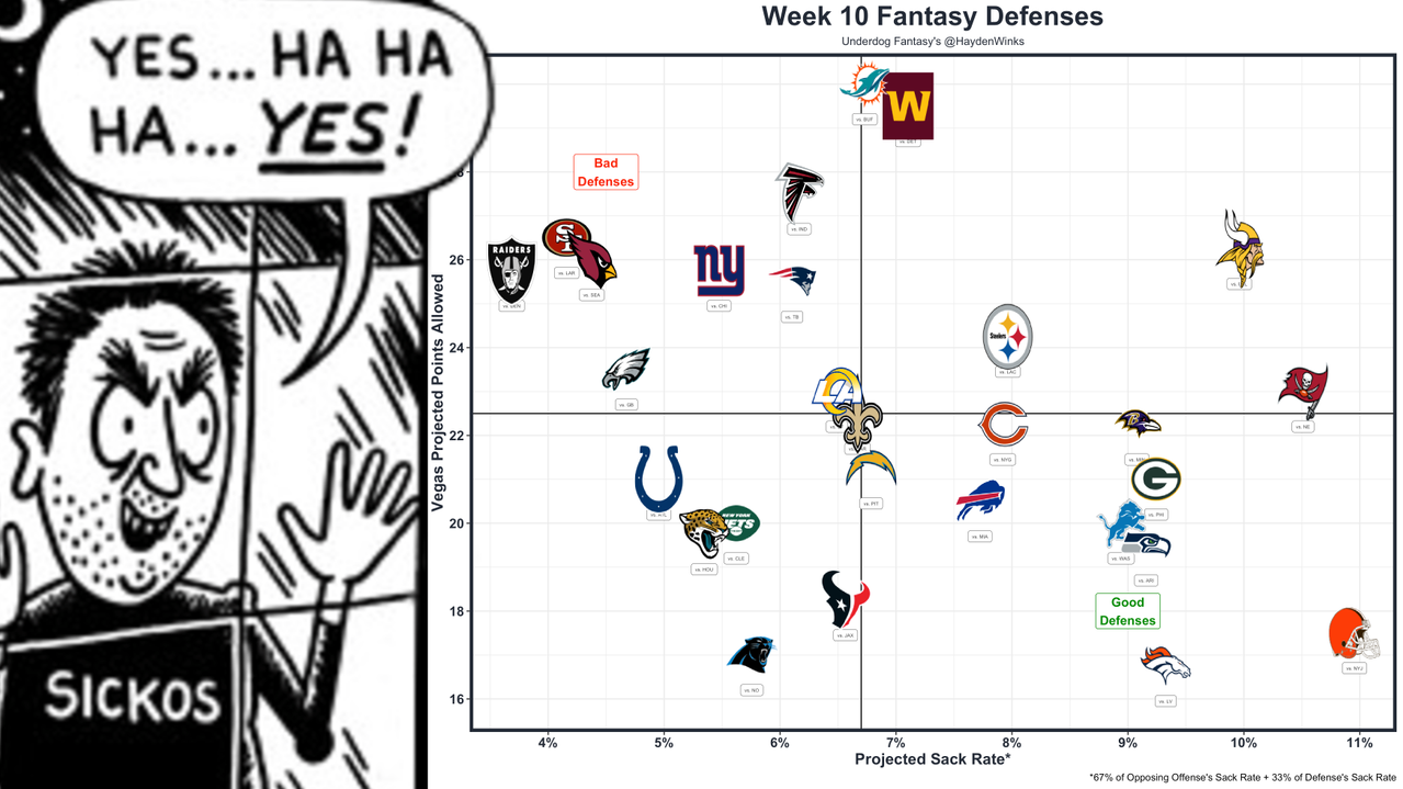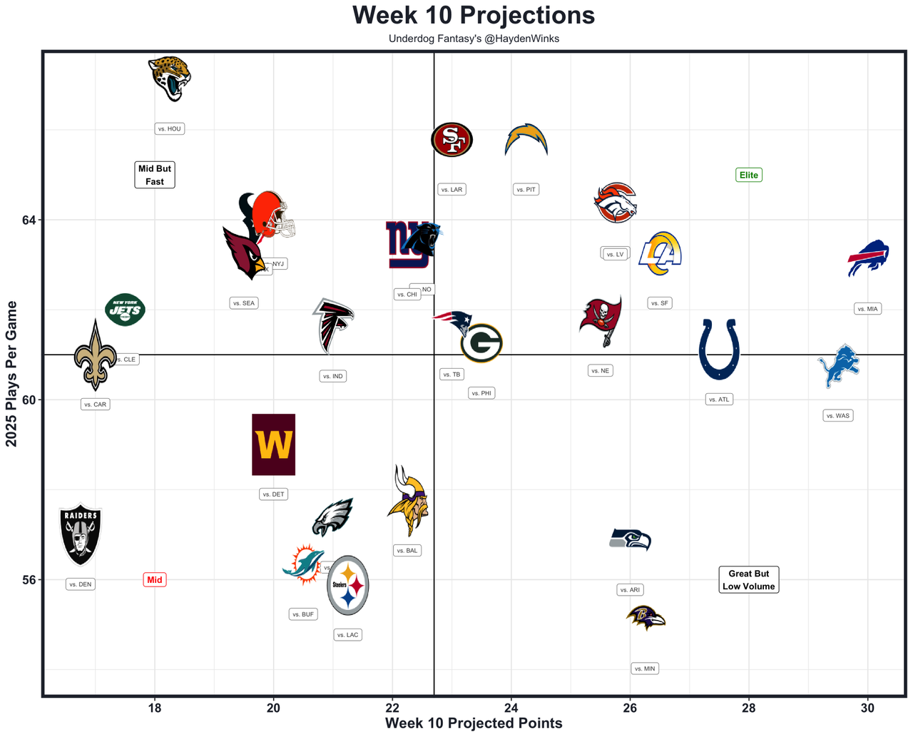He's the RB30 on RB26 usage this month, while losing some fun touches to RJ Harvey, who is essentially Sean Payton's "Joker". That's good and bad. Dobbins isn't really threatened for normal RB work right now, and the Broncos are 7th in projected points this week (25.75) as 9-point home favorites to the Raiders. Las Vegas hasn't faced a difficult schedule of RBs this year, so this is a more friendly matchup than the spreadsheets would suggest.