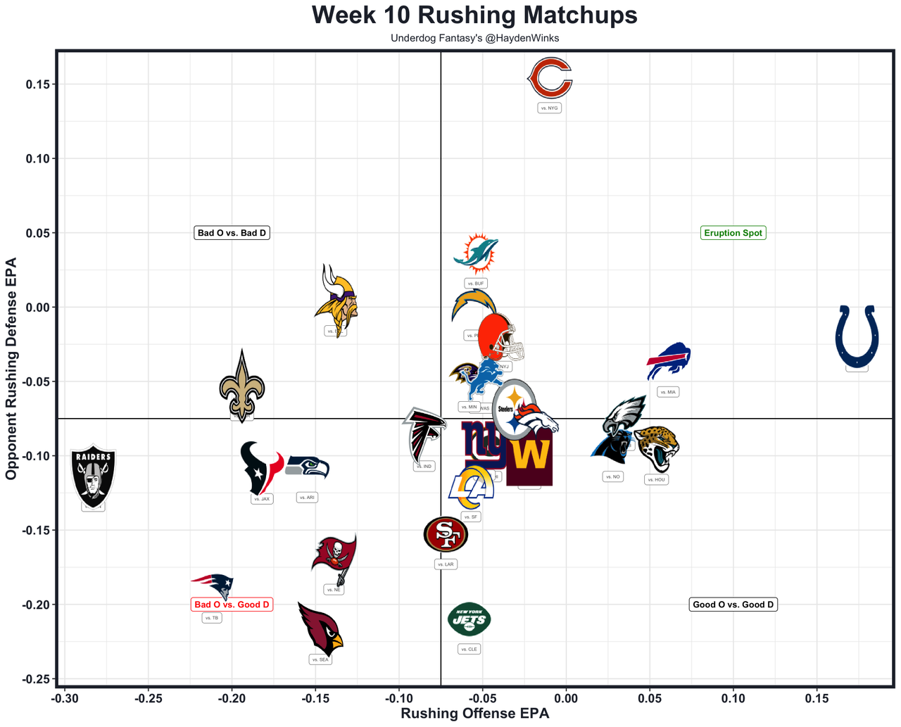 The Bears held D'Andre Swift (groin) out last week, then held RB tryouts on Monday. I'm assuming he's out for now, but he did return to practice in limited fashion on Wednesday. Without him, Monangai had a season-high 25.6 expected half PPR points last week en route to nearly 200 total yards. The Bears are blocking it up well, HC Ben Johnson is fully in his bag, and Monangai is a totally fine talent. Chicago is 8th in projected points this week (25.5), and the Giants have been 2nd-worst against fantasy RBs while allowing the most rushing EPA allowed and yards per carry to RBs. It's a shit show in New York despite their DL investments.