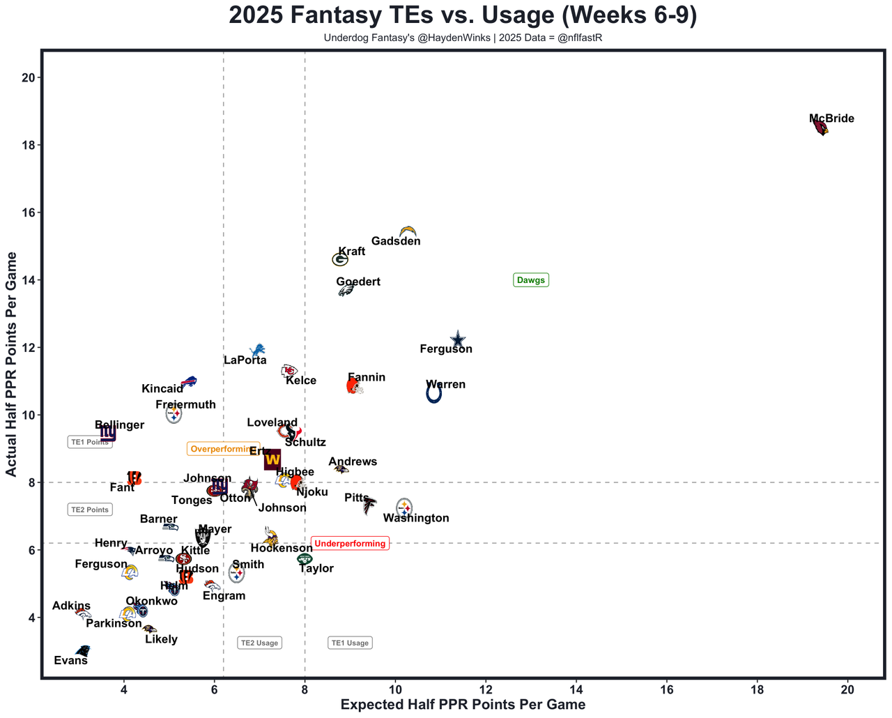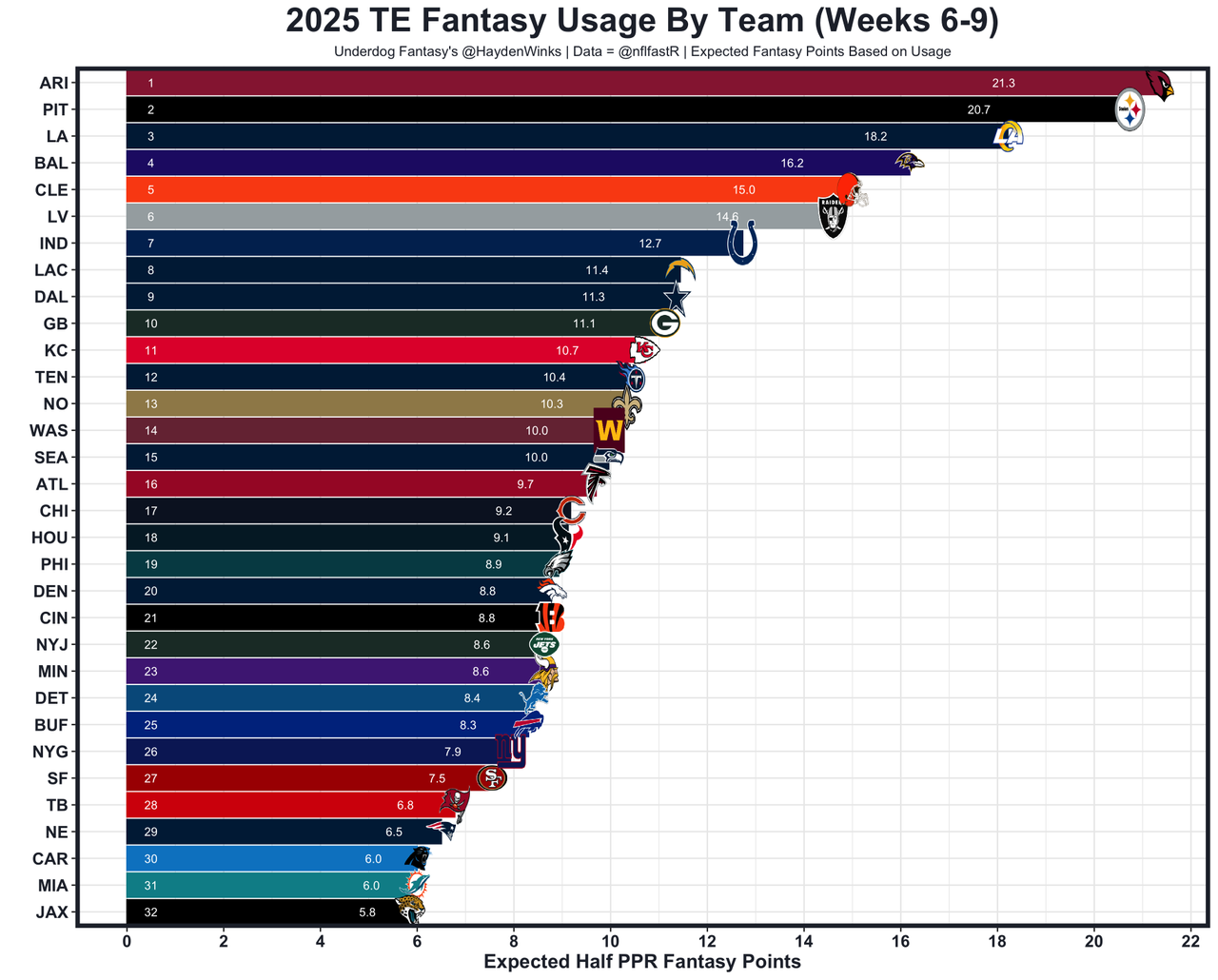 The Steelers are 3rd-worst against fantasy TEs, with Tucker Kraft (29.8 half PPR), Noah Fant (12.4), Harold Fannin (11.6), and Hunter Henry (25.0) all popping off. Gadsden would benefit from a quick-hitting approach against this edge rush group with the Chargers missing LT Joe Alt. Gadsden is the TE5 on TE4 usage this month. It's been all real stuff.