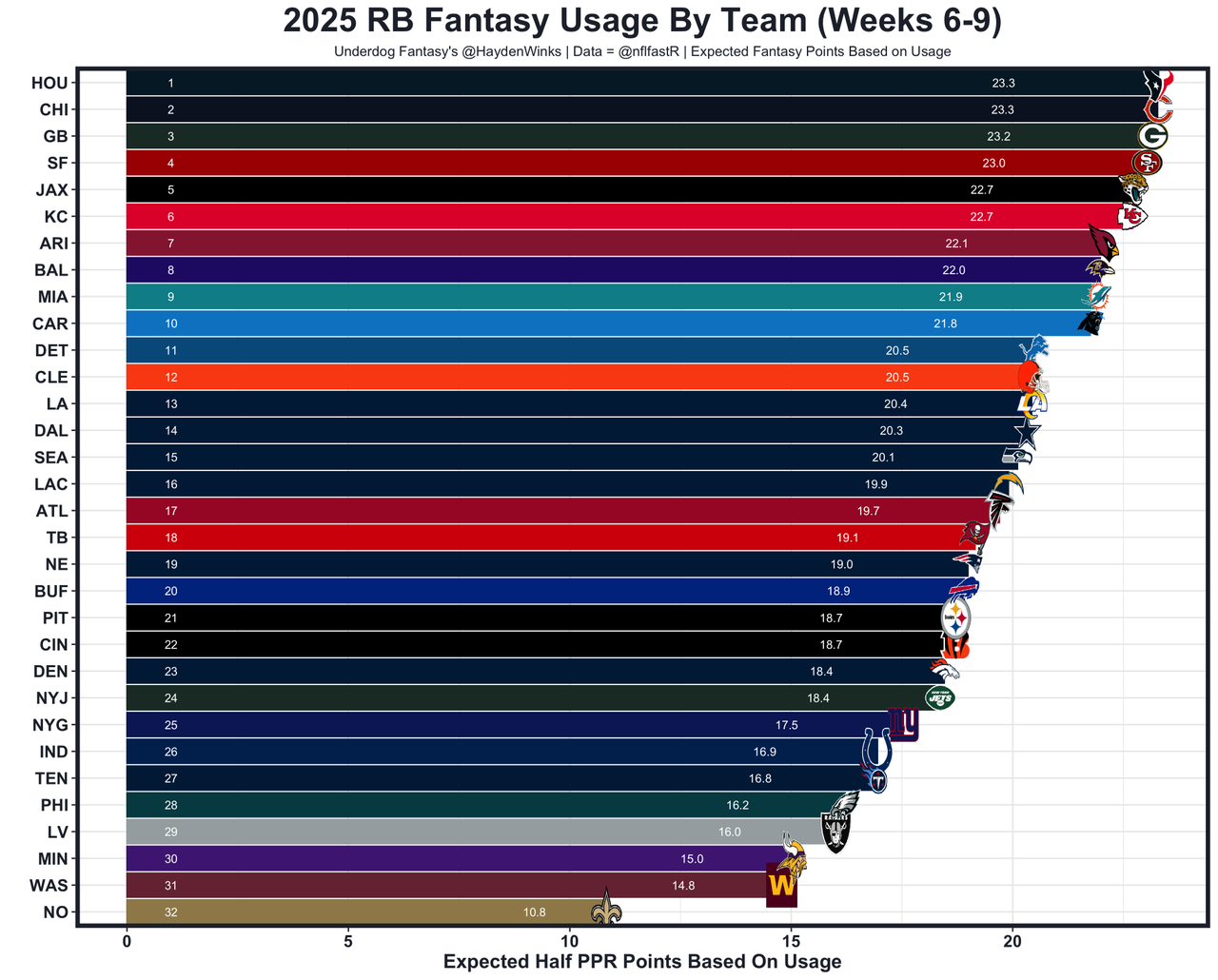 He's the RB27 on RB20 usage this month, while still splitting the work with Nick Chubb fairly evenly. Marks, I guess, is a bit better but he's still struggling in general. I break ties in his favor because offenses facing the Jaguars pass the ball in neutral situations at the highest rate. That leans more Marks than Chubb, but neither profile well without CJ Stroud. The Texans are projected for just 18.25 points.