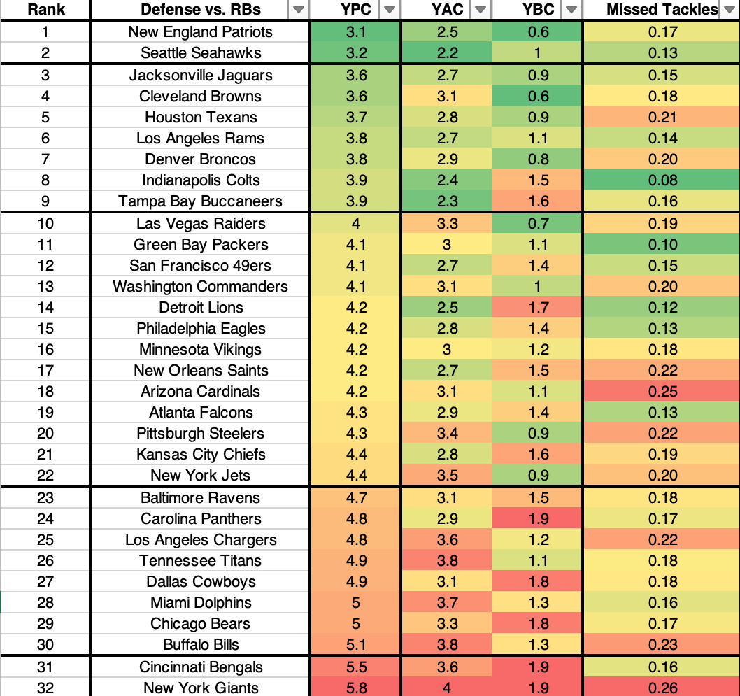 The Colts are the best defense in avoiding missed tackles on RB carries.
