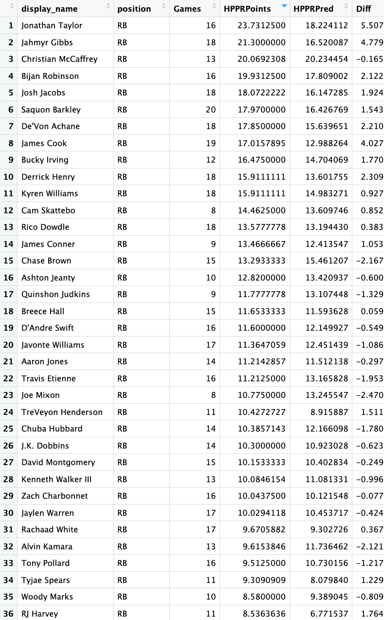 Update: Isiah Pacheco (knee) returned to practice on Wednesday. This ranking assumes Pacheco is back. In his last 4 games with Pacheco healthy, Hunt averaged 8.8 expected half PPR points.